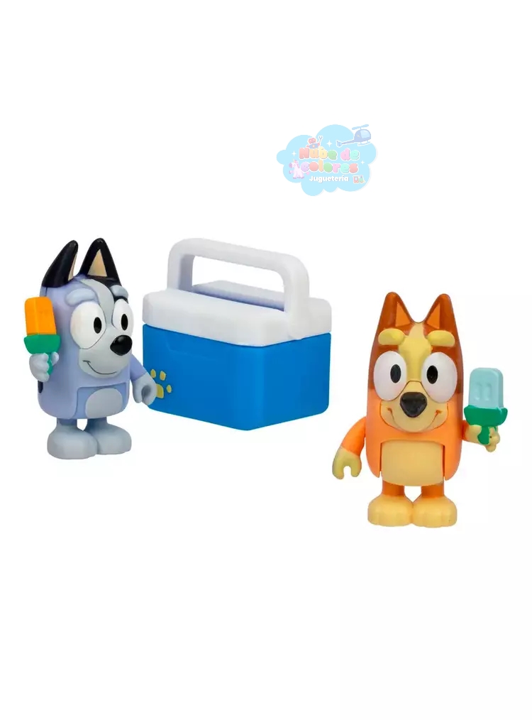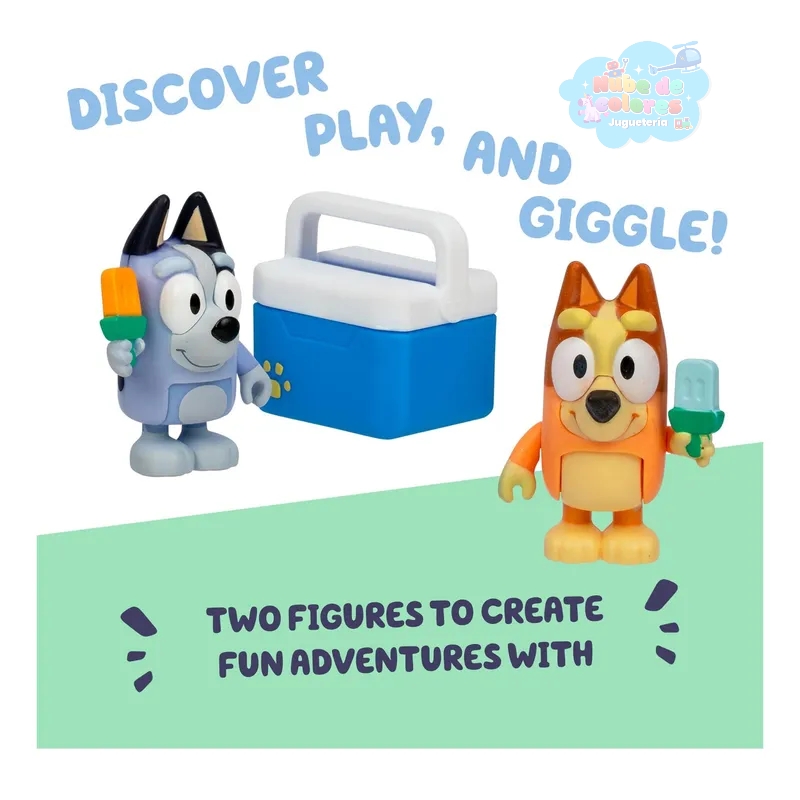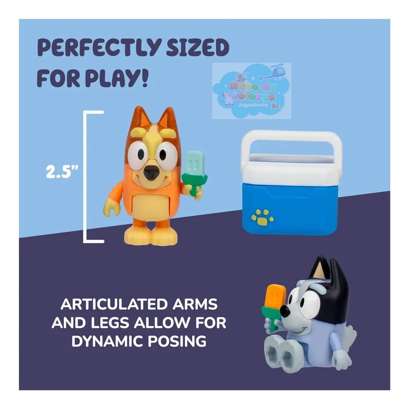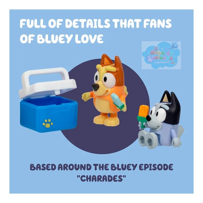 Paquete de 2 figuras articuladas de la serie animada «Bluey», que incluye accesorios específicos basados en episodios, como el set «Ice Blocks» o «Let’s Play Chef».