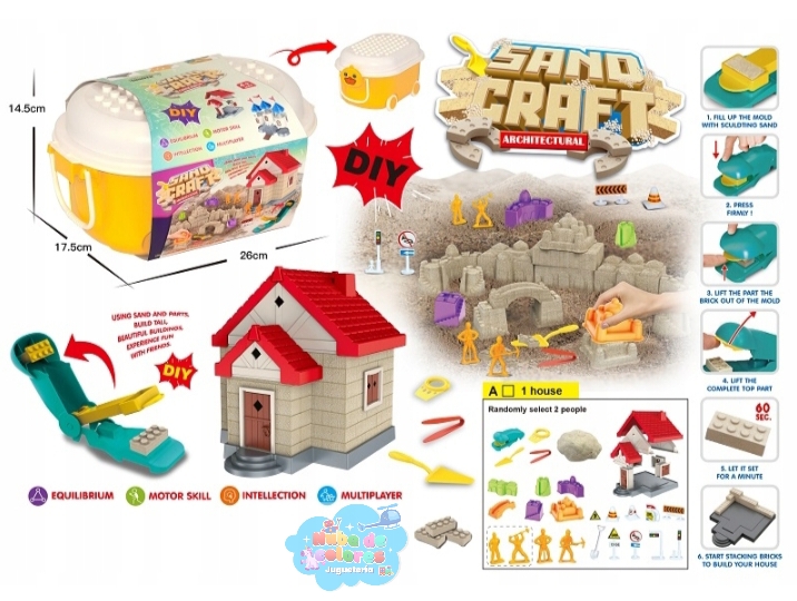 - ¿Para qué sirve? Sirve para fomentar la creatividad, la imaginación, las habilidades motoras y el equilibrio a través del juego constructivo. El set incluye herramientas para cortar y combinar los ladrillos de arena.
