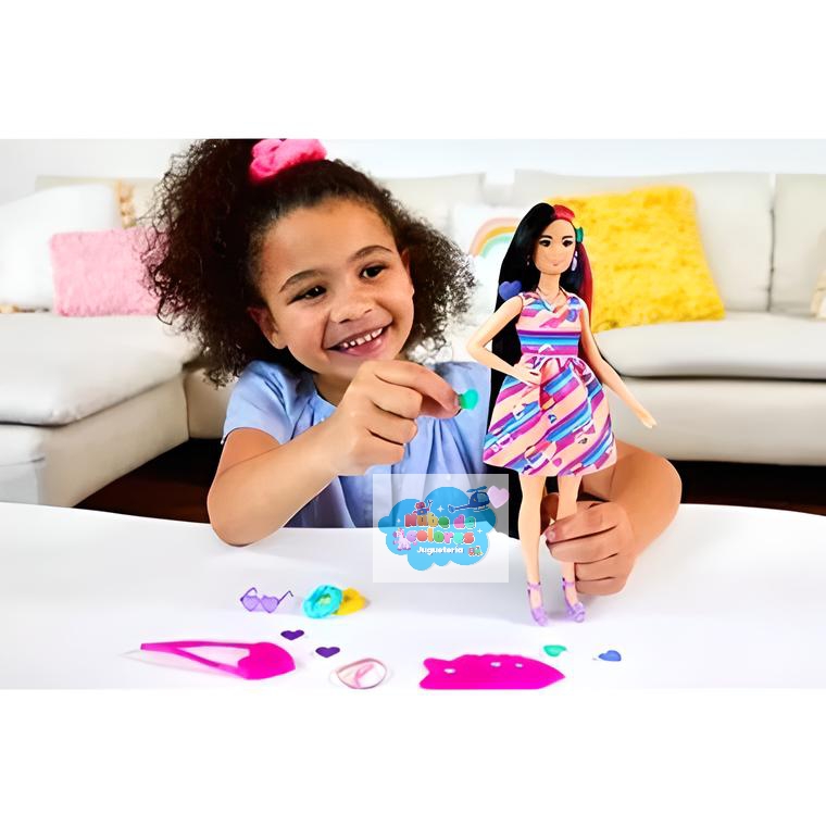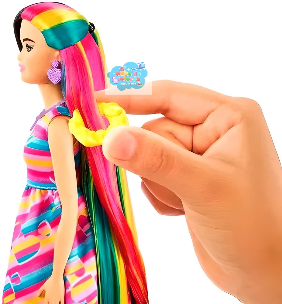 La muñeca tiene 8.5 pulgadas de pelo extra largo jugable y viene con más de 15 piezas adicionales: 8 son pinzas para el cabello que cambian de color, un peine, 1 juego de ligas para el cabello, 2 coletas, chaleco metálico, bolso, gafas de sol y un collar.