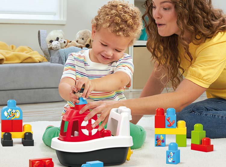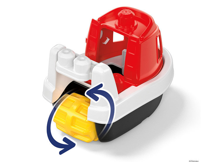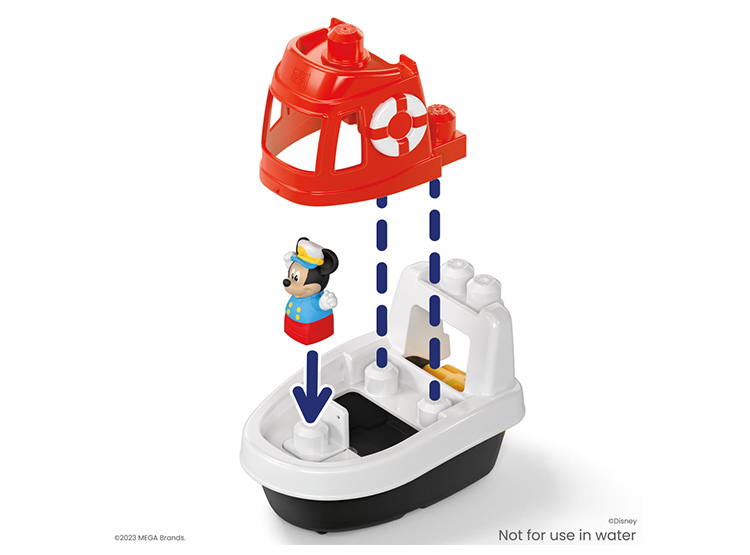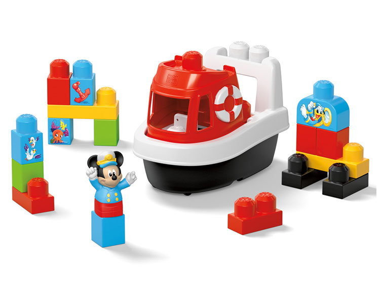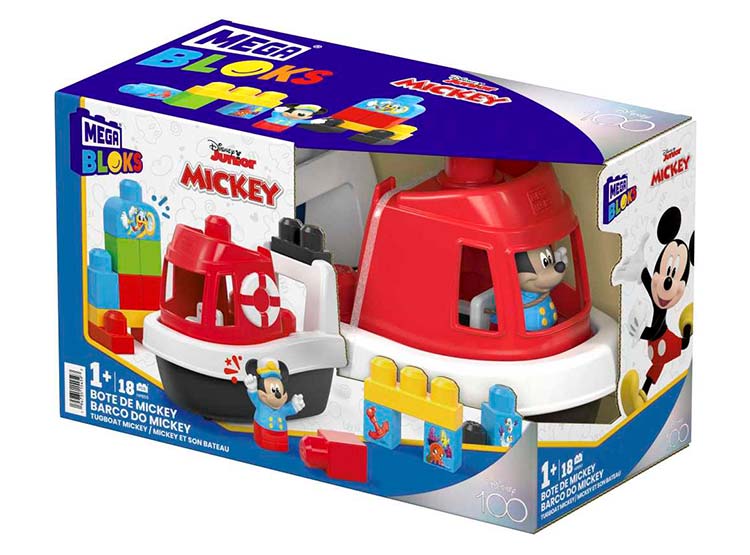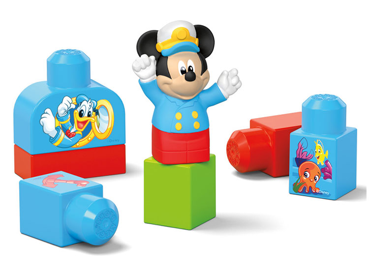 HORA DE ZAPAR. El set de construcción incluye 1 barquito, 1 figura de Mickey Mouse, 1 barquito y 16 bloques de construcción grandes. Algunos bloques pueden guardarse dentro del barco para una fácil limpieza.