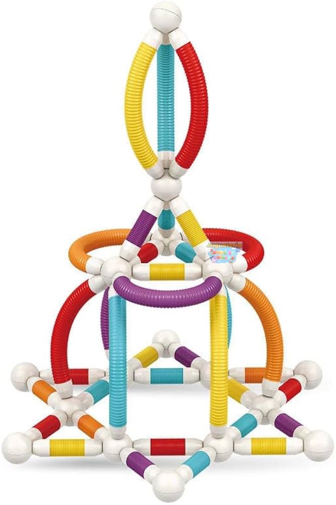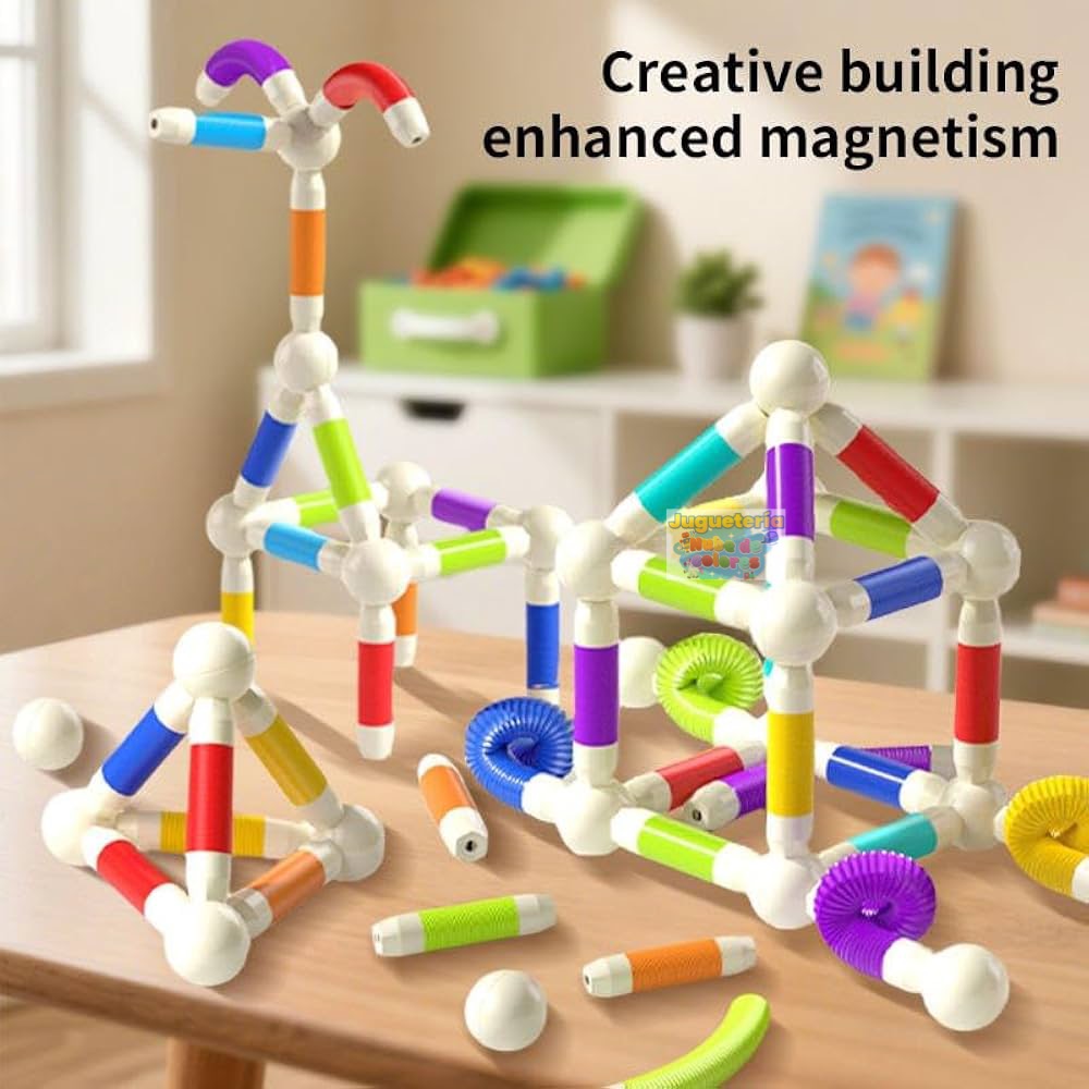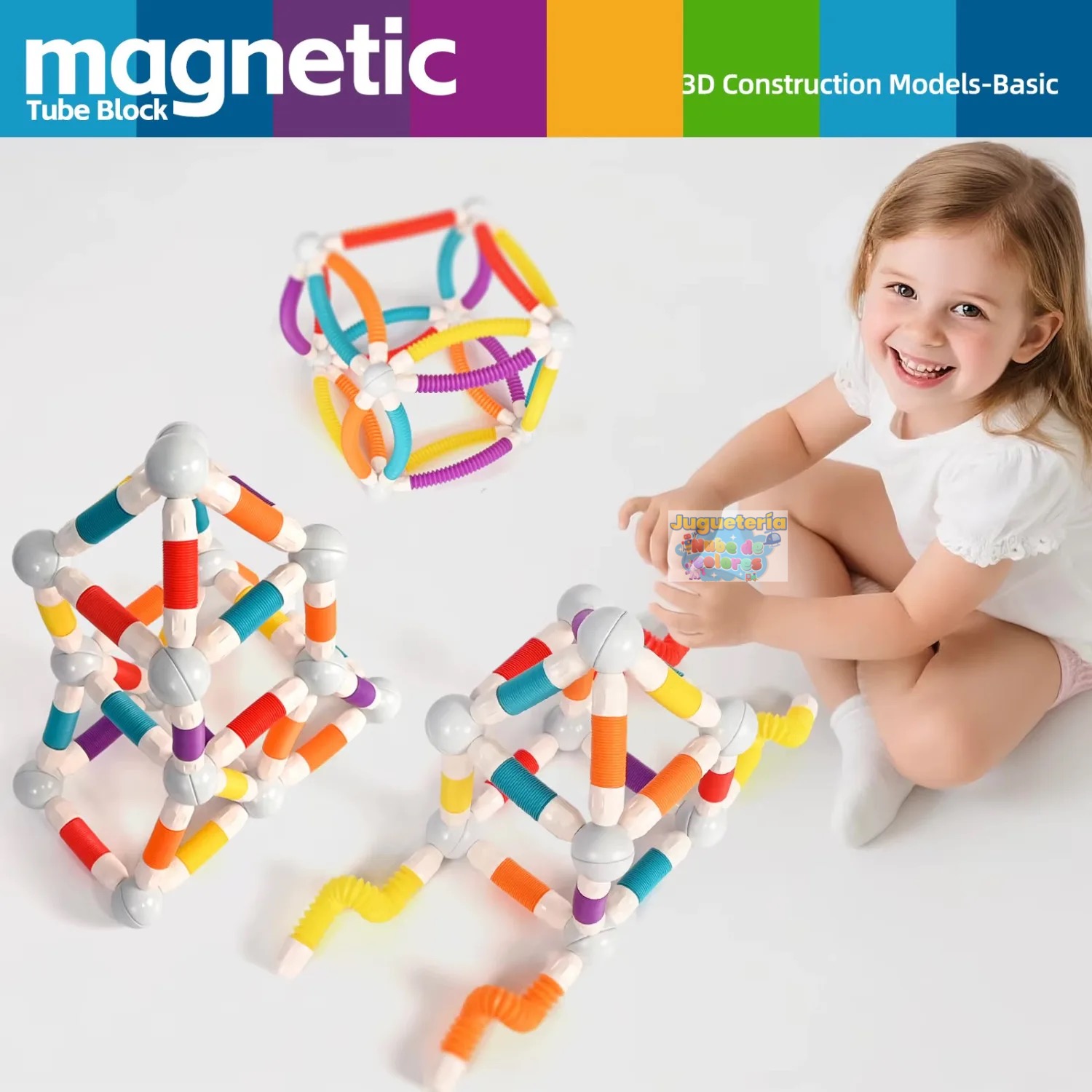 Juego de bloques magnéticos flexibles compuesto 66 piezas articuladas y conectores que permiten crear infinitas construcciones en 2D y 3D. Su diseño flexible y colorido invita a explorar, doblar, unir y transformar, fomentando la creatividad, la imaginación y el aprendizaje a través del juego libre.