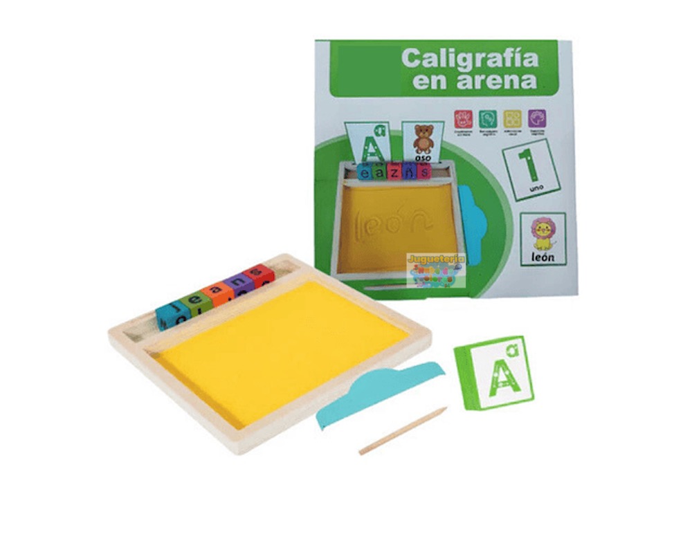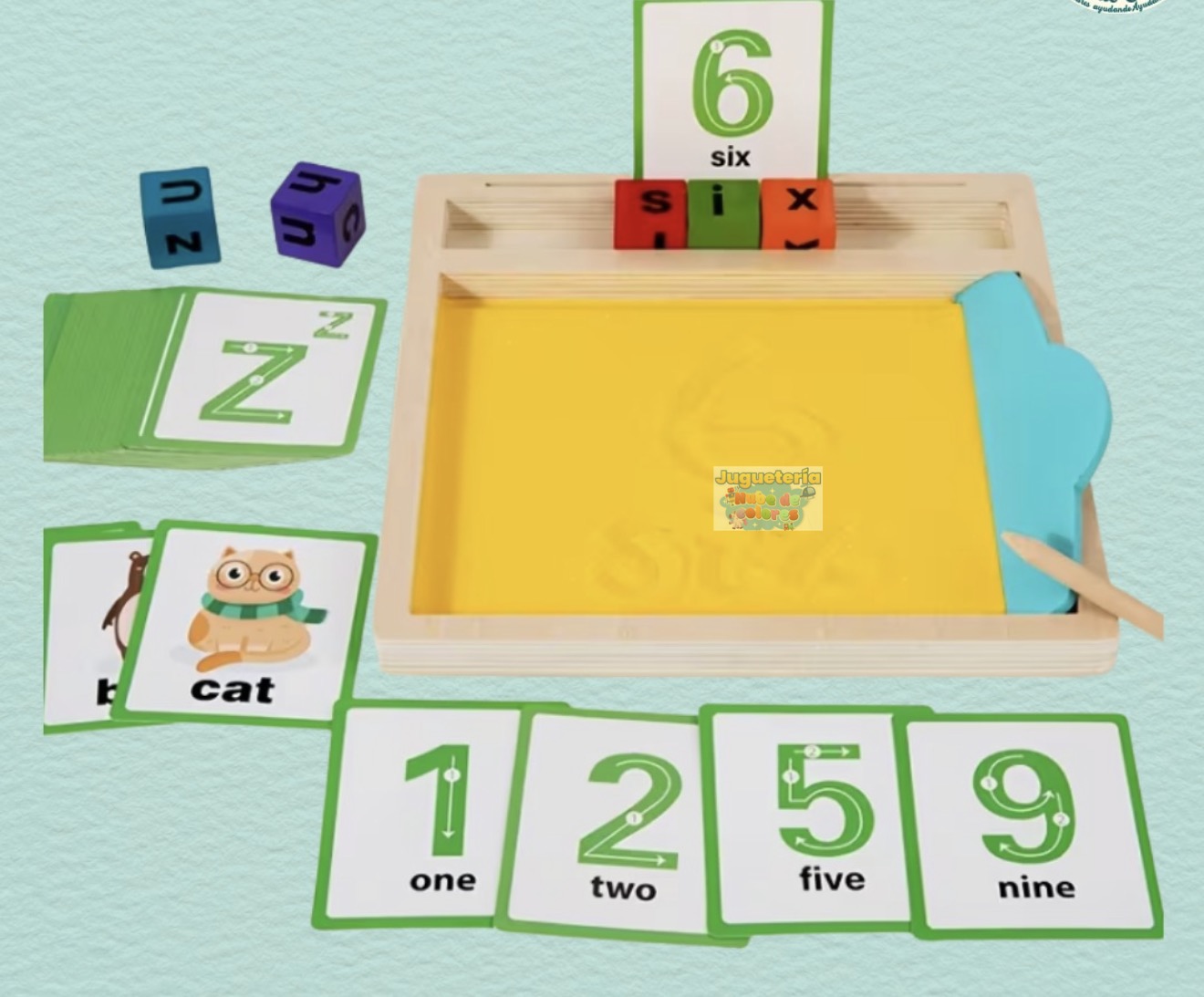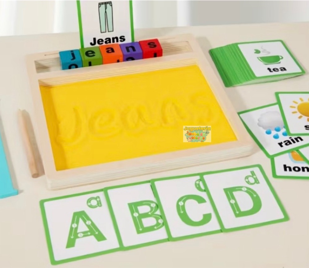 Set educativo que incluye bandeja sensorial (arena fina o material táctil), tarjetas con letras y palabras, y cubos para formar vocabulario. Permite practicar escritura trazando con el dedo o lápiz, reforzando el aprendizaje de manera lúdica y multisensorial.