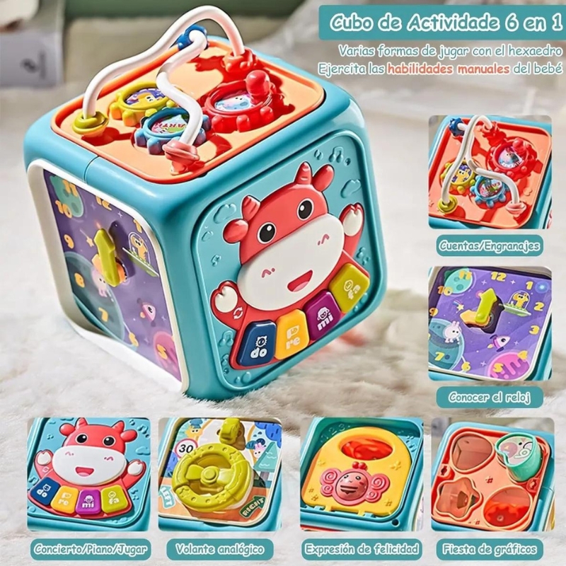 - Cubo de actividad 6 en 1: incluye clasificador de formas, engranajes y cuentas, teclado de tambor y piano ligero, bonita puerta de abeja, conducción simulada, cognición del reloj. 4 tipos de efectos de sonido animal, 4 canciones, 20 efectos de sonido. Múltiples actividades para entretener al bebé por un buen tiempo