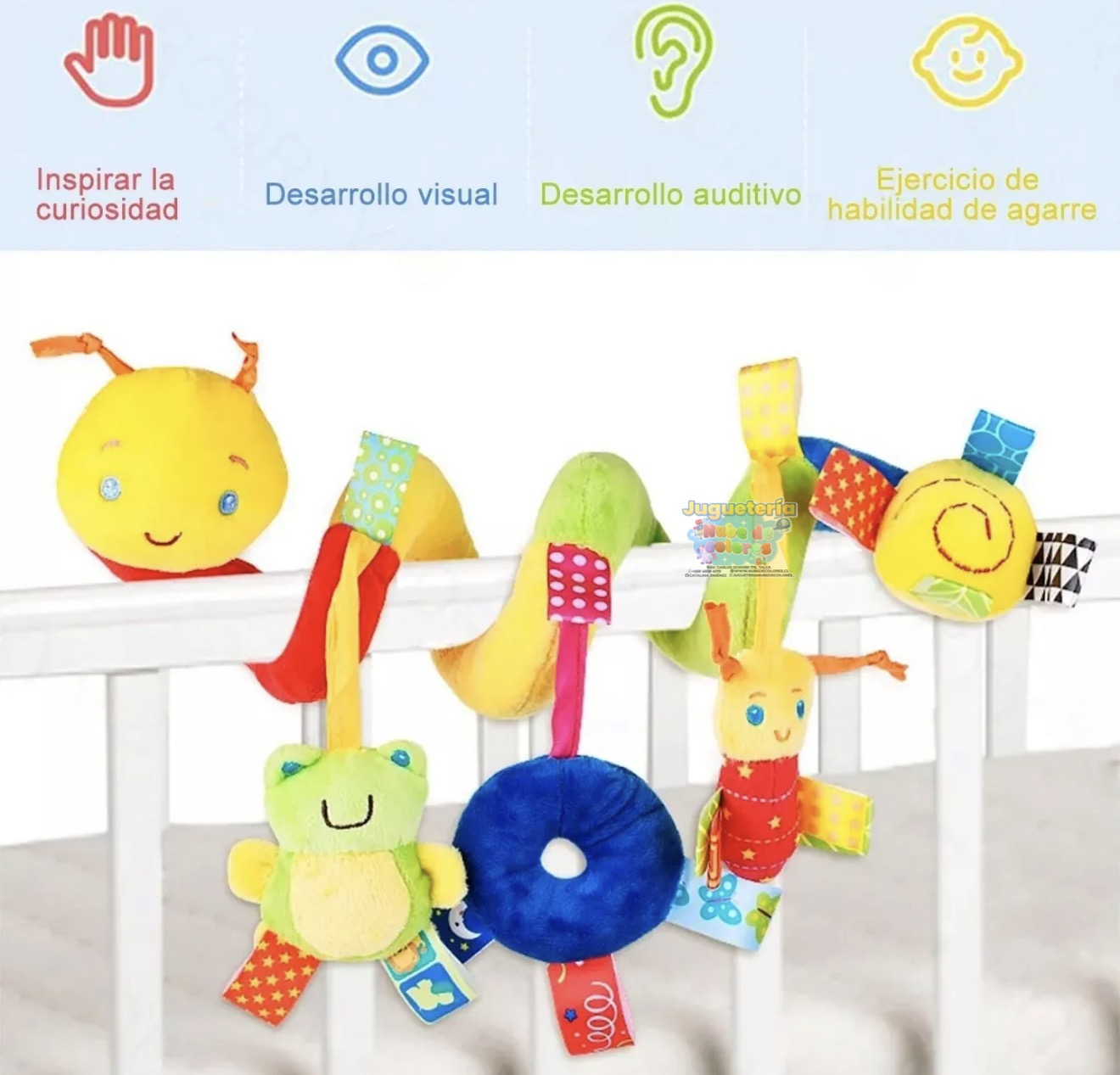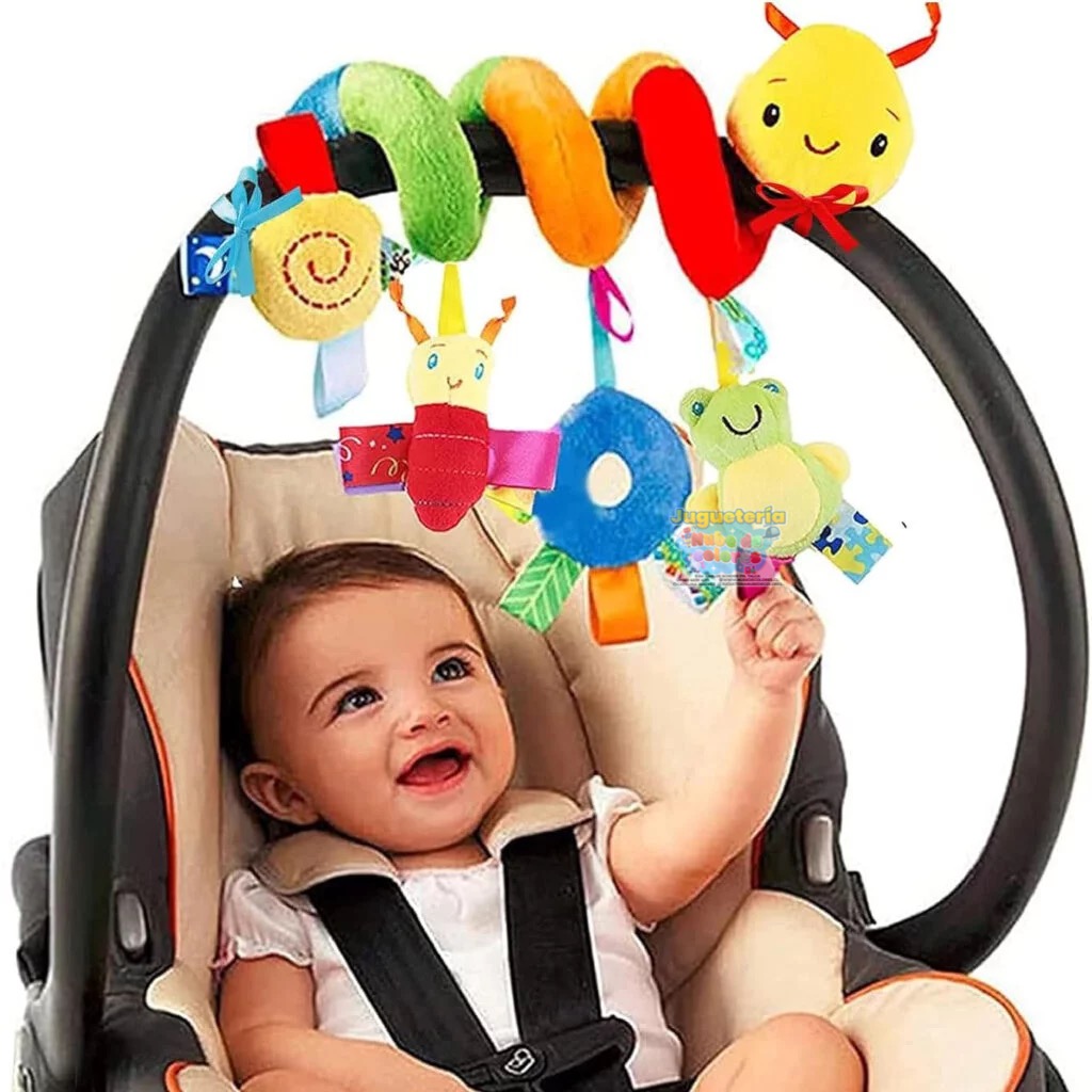 Esta espiral de actividades se adapta fácilmente al coche, cuna o silla del auto, acompañando al bebé en cada paseo con colores, sonidos y texturas.
