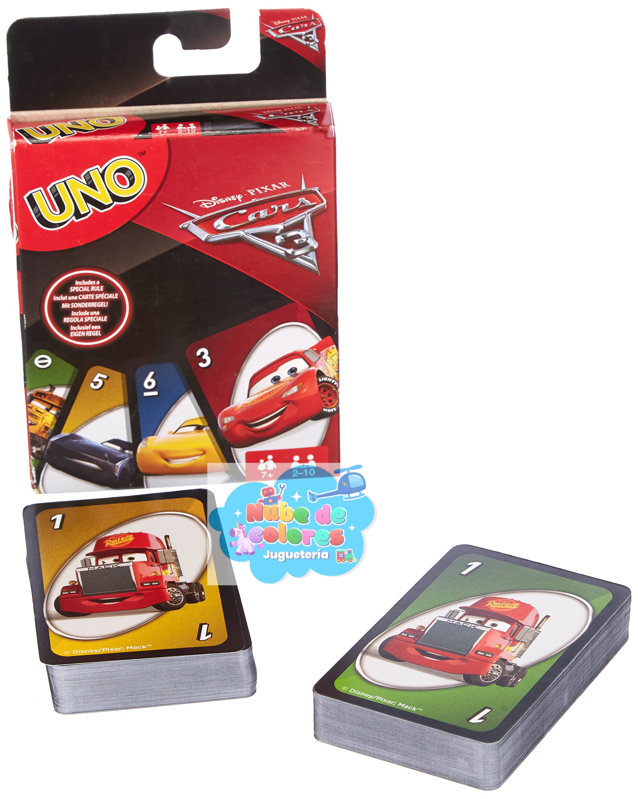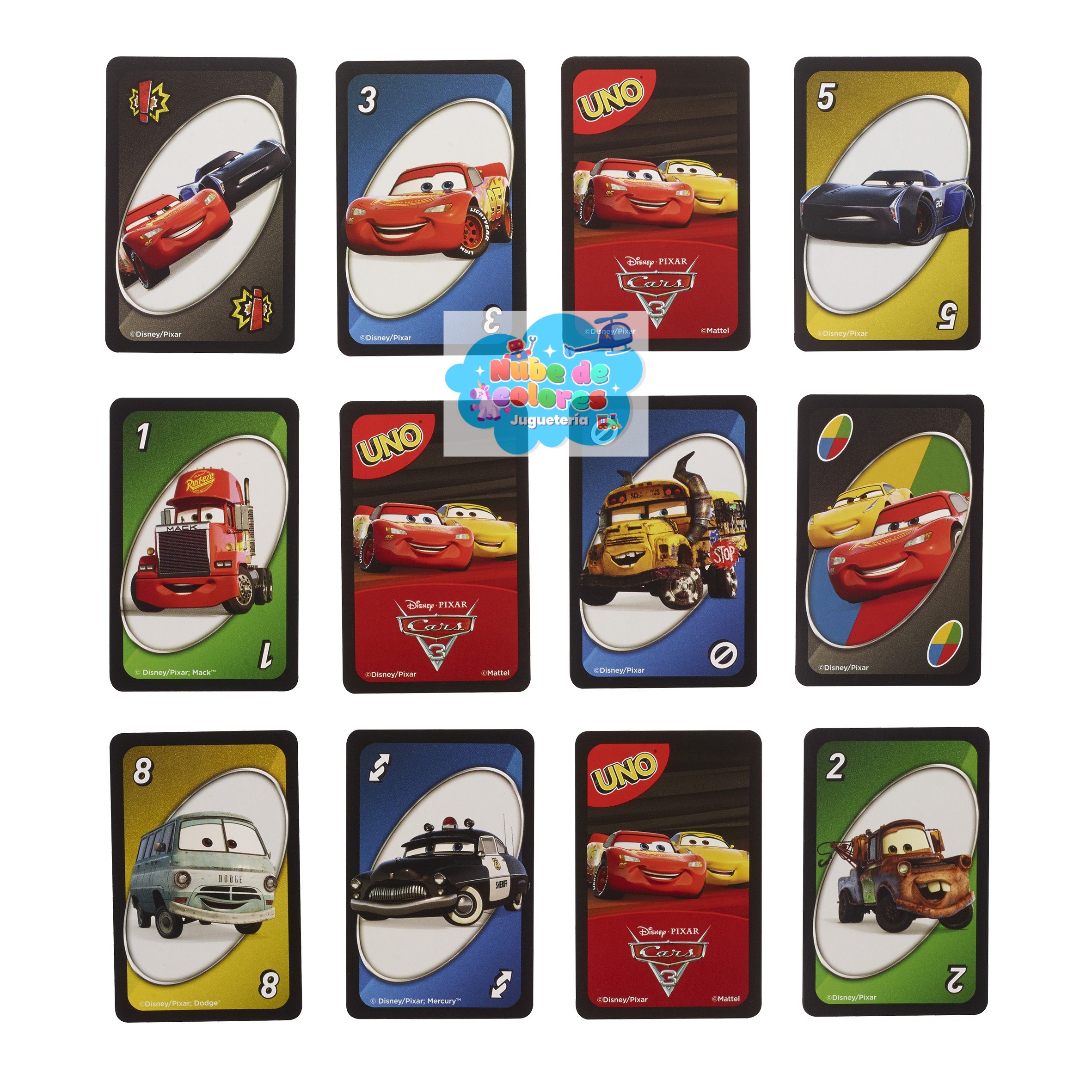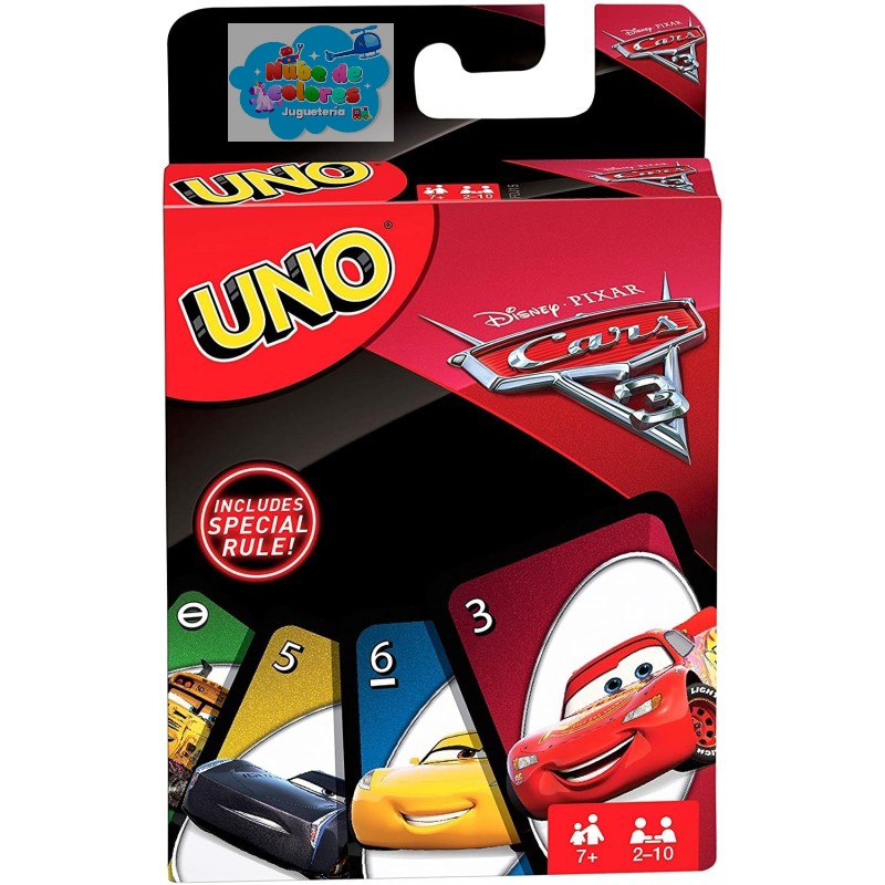 El clásico juego de cartas UNO, pero con diseños de personajes de la película Cars 3 de Disney Pixar en cada carta.