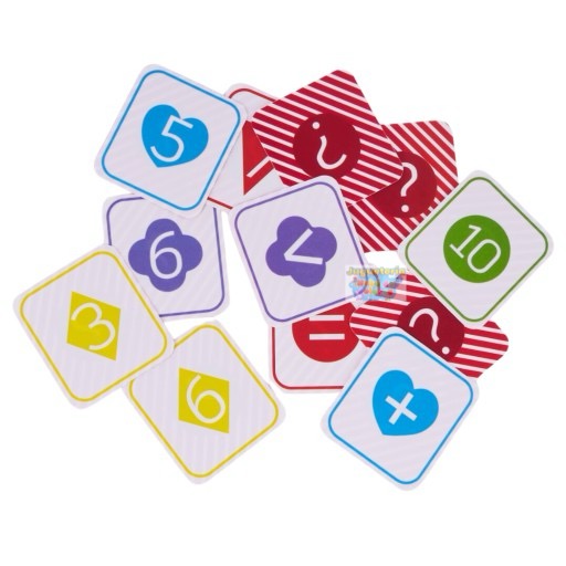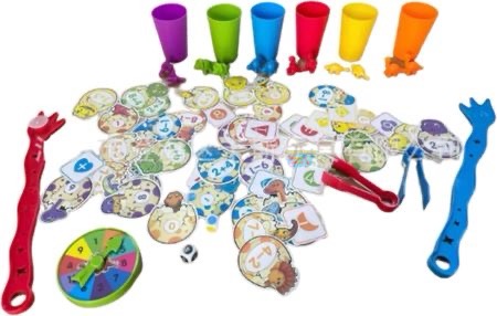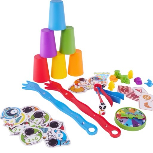 figuras para clasificar, fichas con operaciones matemáticas, cantidad y patrones, pinzas, vasos, matamoscas en forma de manito con ventosa que permite adherir las tarjetas de una manera más divertida, dados y mucho más.