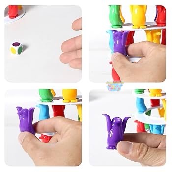 3. Con cuidado, deben quitar un pingüino del color que salió sin que la torre se derrumbe.