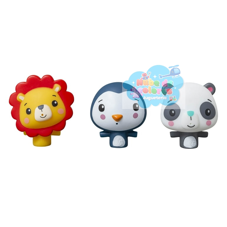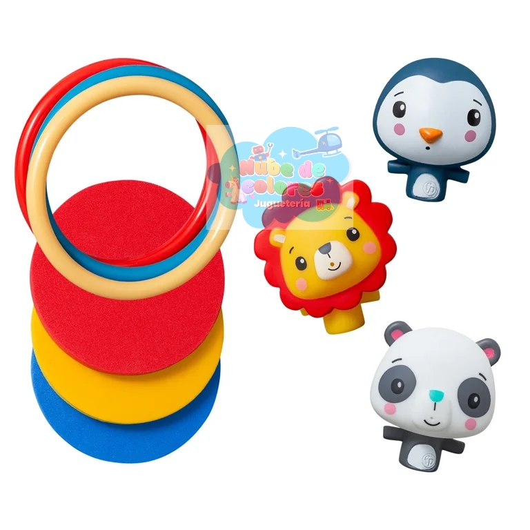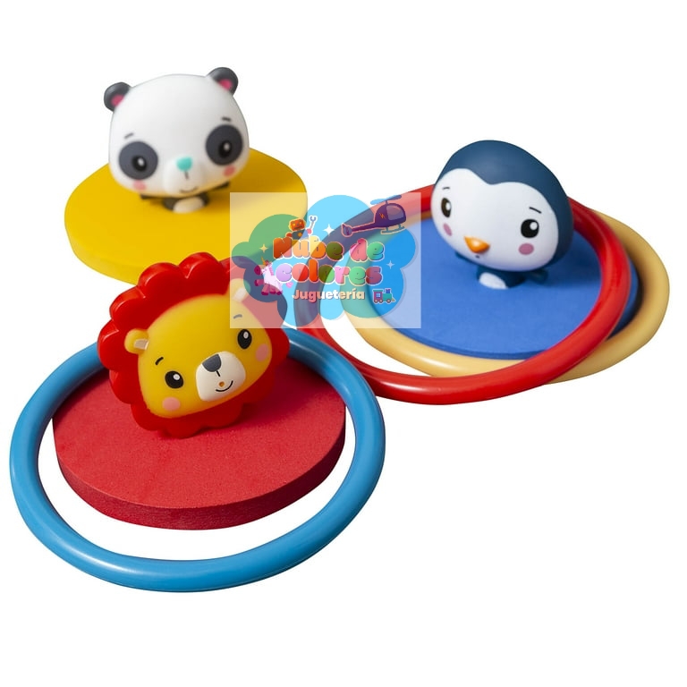 El juego incluye un león, un panda y un pingüino, tres flotadores de espuma y tres anillos de juguete.