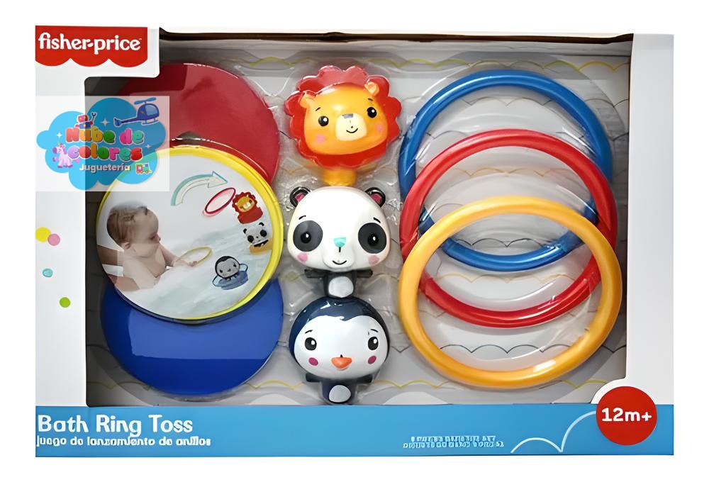 Este es un juguete de baño para bebés llamado «Fisher-Price Ring Toss Baby Bath Toy».