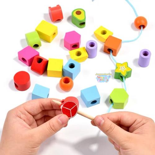 Este completo set combina el enhebrado, la clasificación y la lógica en un solo juguete de madera, ideal para estimular habilidades esenciales en la infancia. Incluye figuras coloridas con formas geométricas y de frutas, cordones con punta de madera, tarjetas con patrones y una base para apilar.