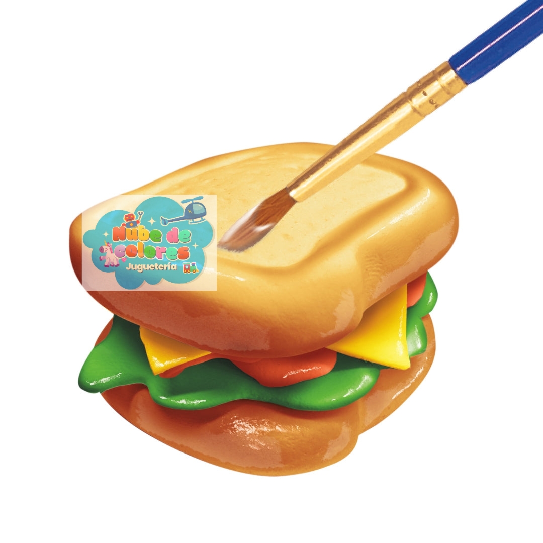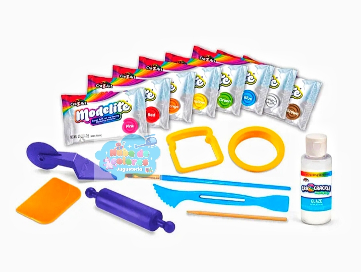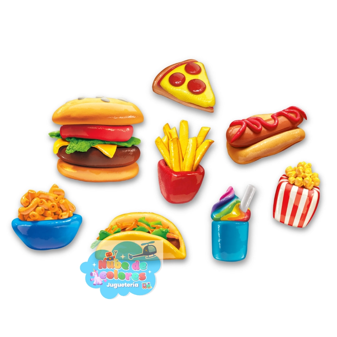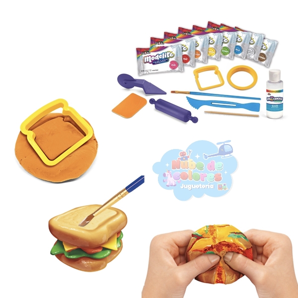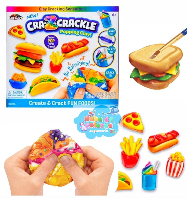 Incluye arcilla Modelite, esmalte Cra-Z-Crackle de secado rápido, herramientas para esculpir y moldes para crear «comidas divertidas» como hamburguesas, pizzas y papas fritas.