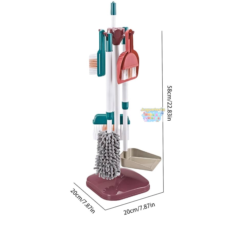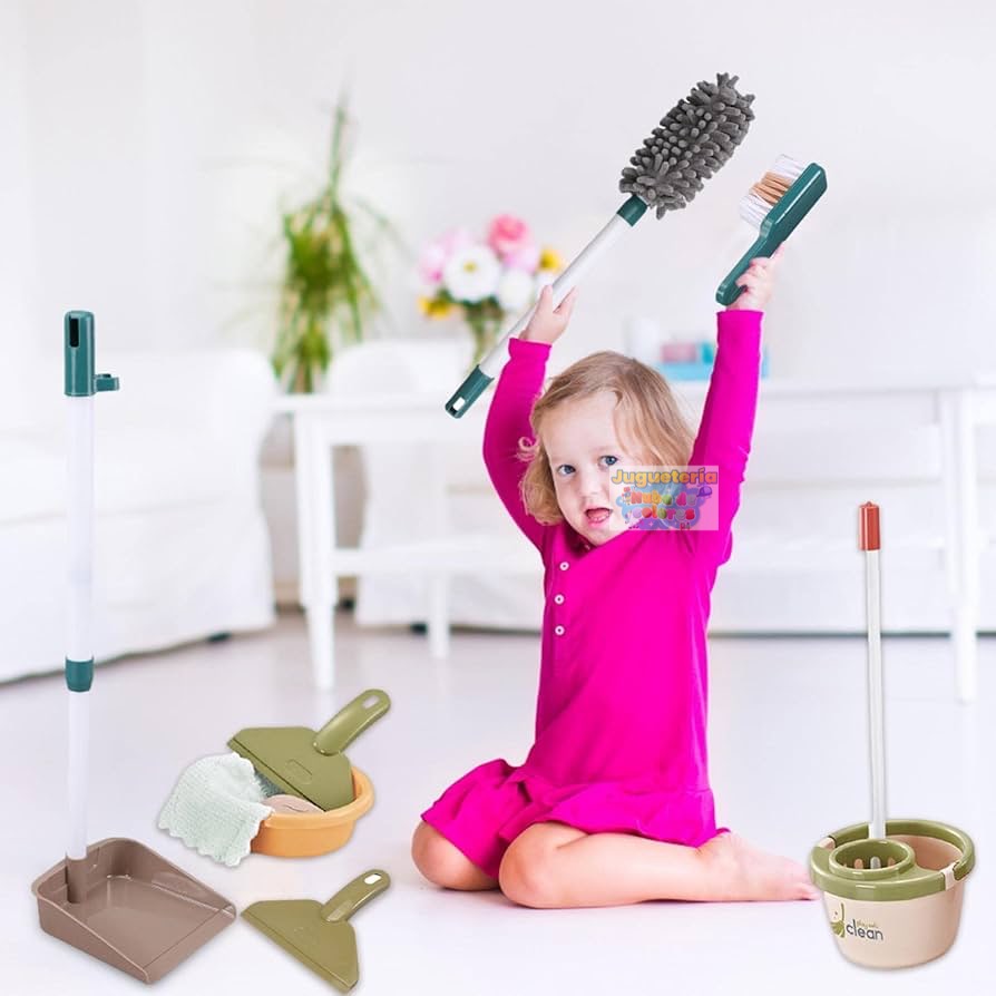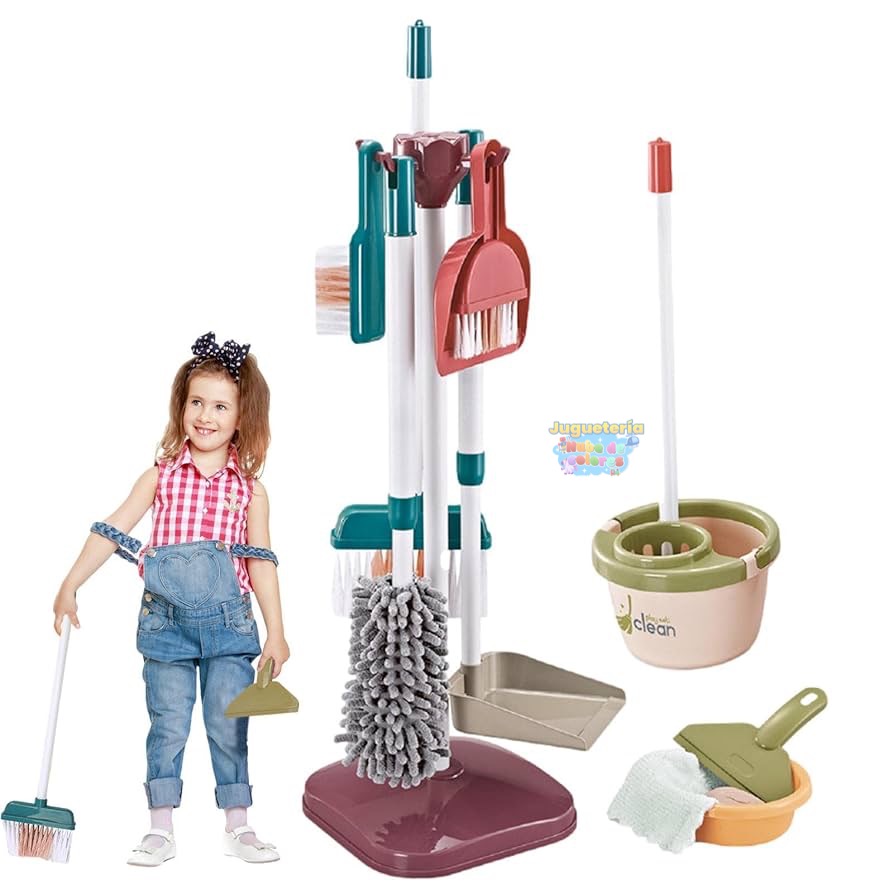 Contenido:El juego incluye diversas herramientas de limpieza en miniatura, como escoba, recogedor, cubo y otros accesorios, como se muestra en la imagen.