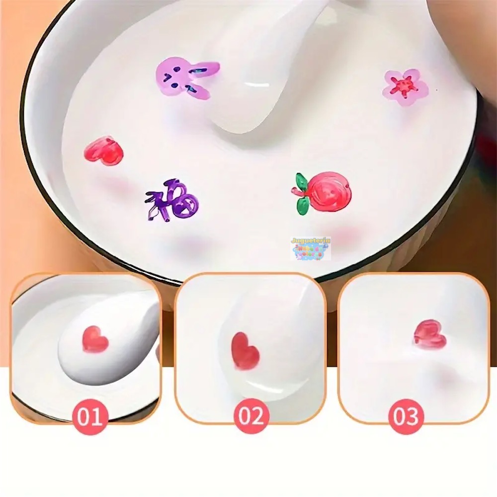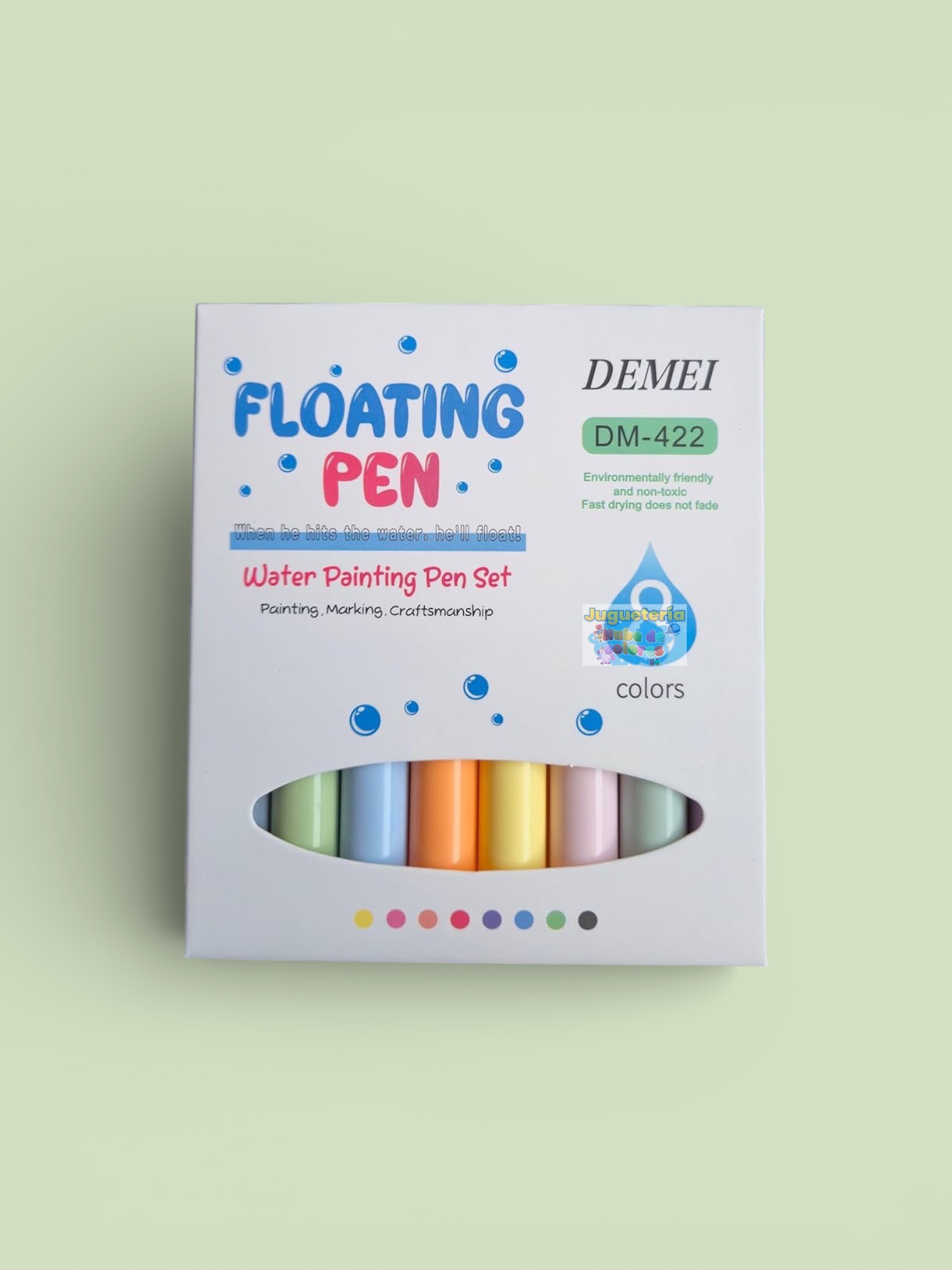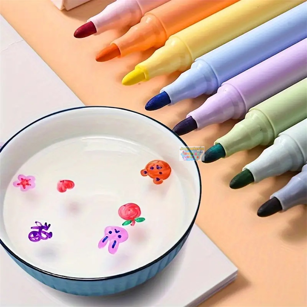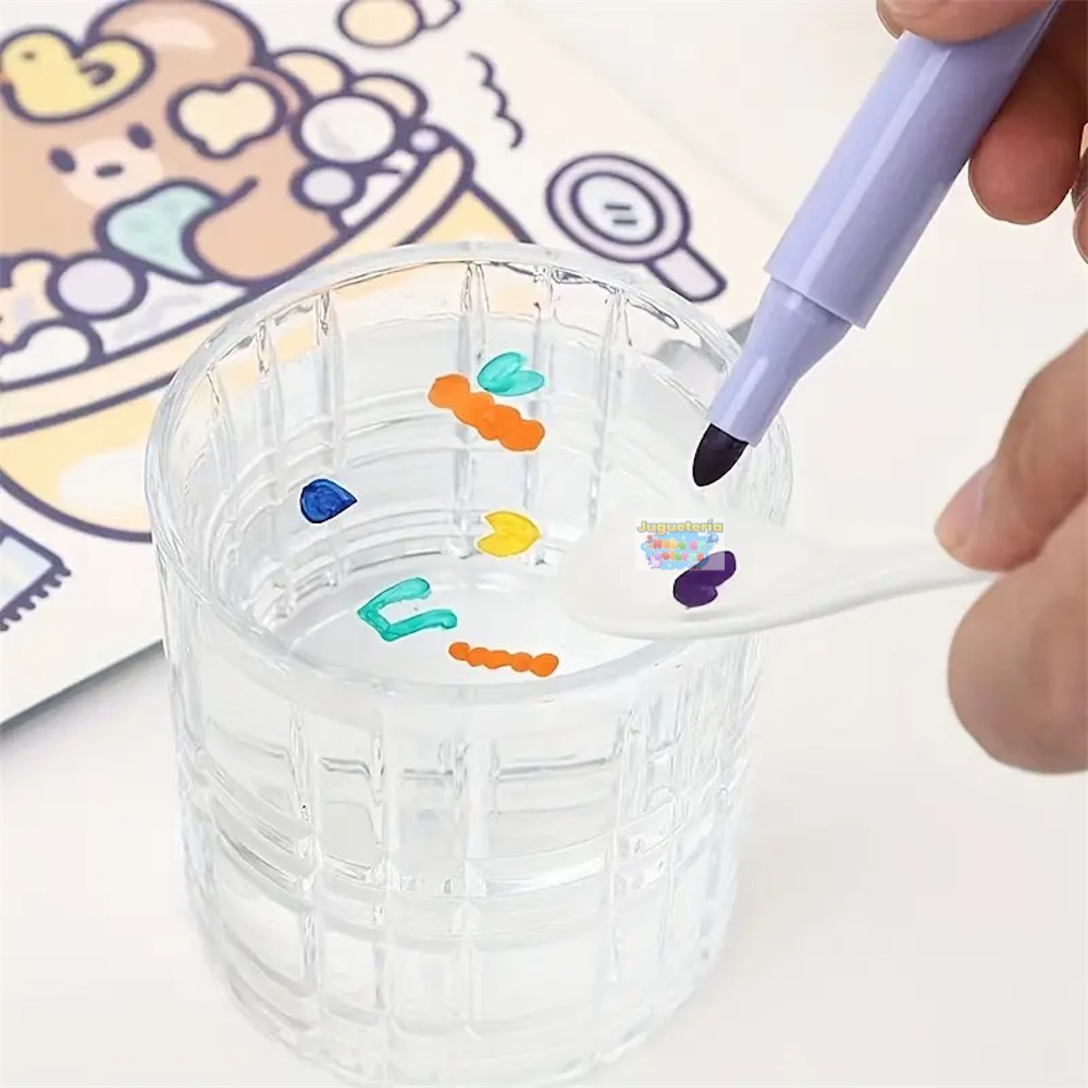 Set de marcadores especiales que permiten dibujar sobre superficies lisas y hacer que el dibujo flote en el agua, creando un efecto mágico y sorprendente que fascina a niños y adultos.