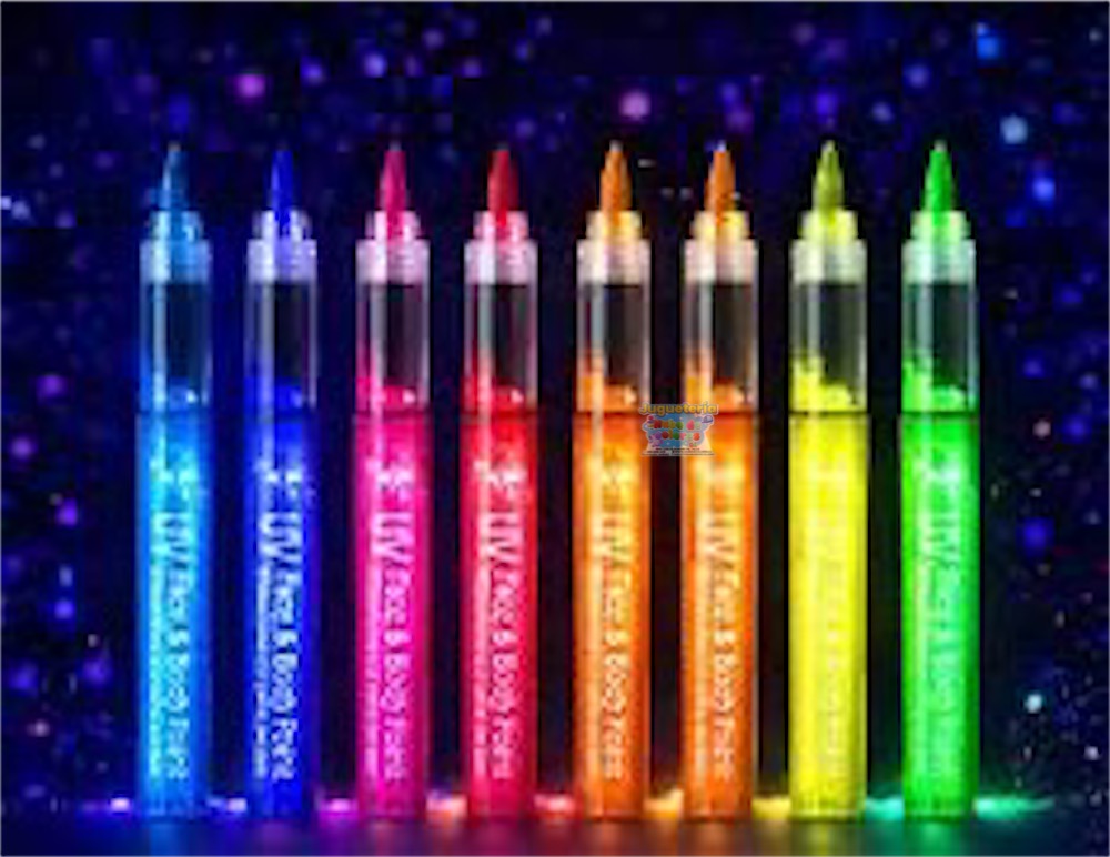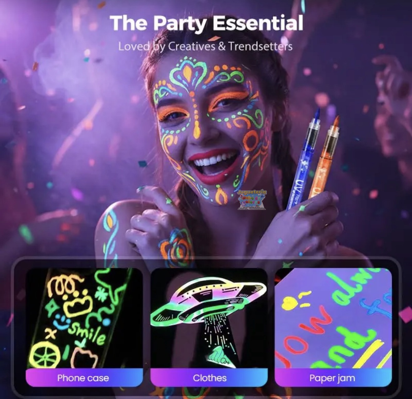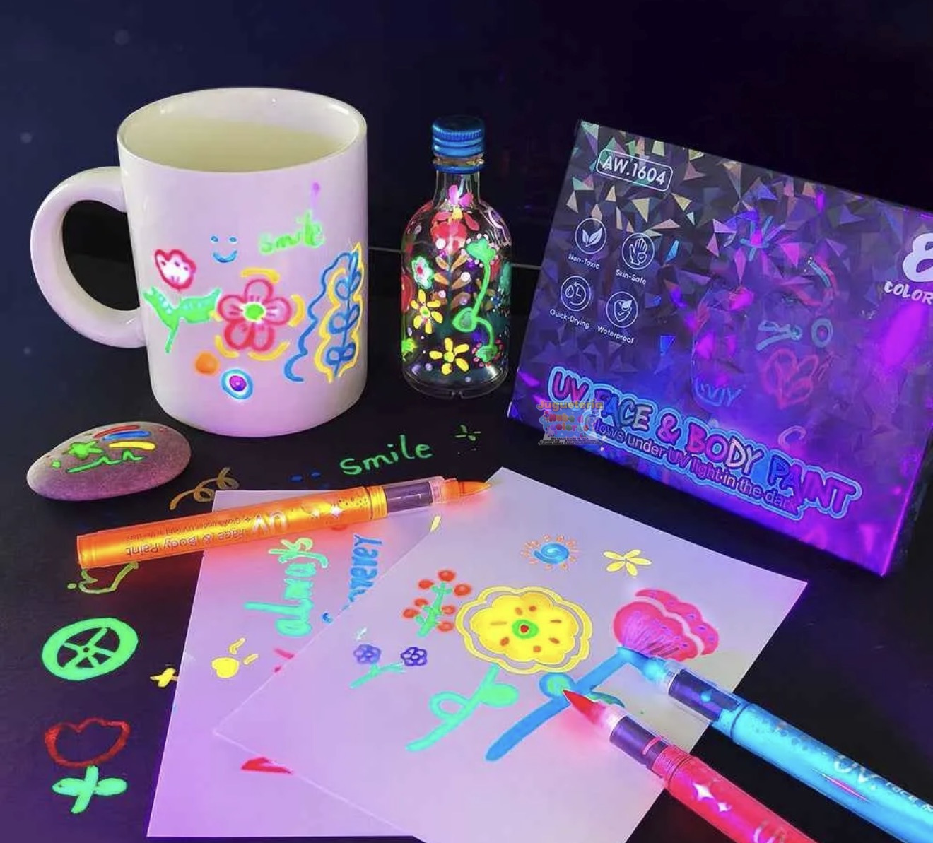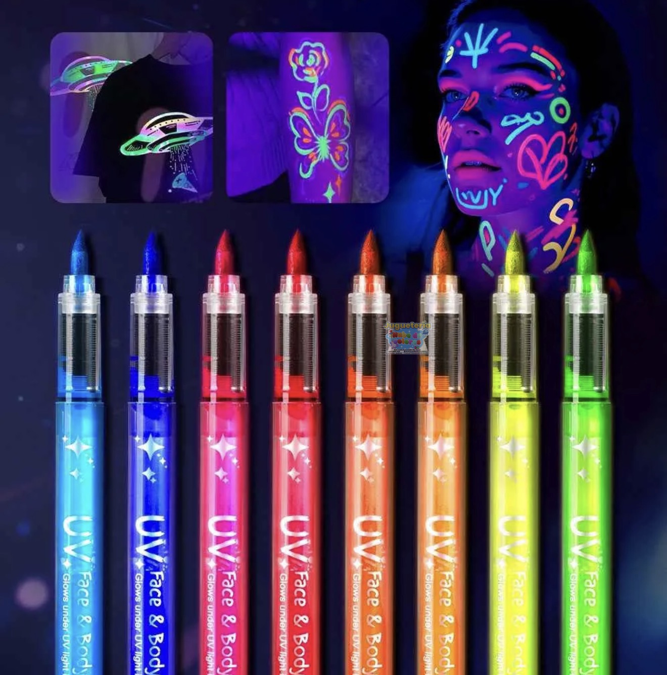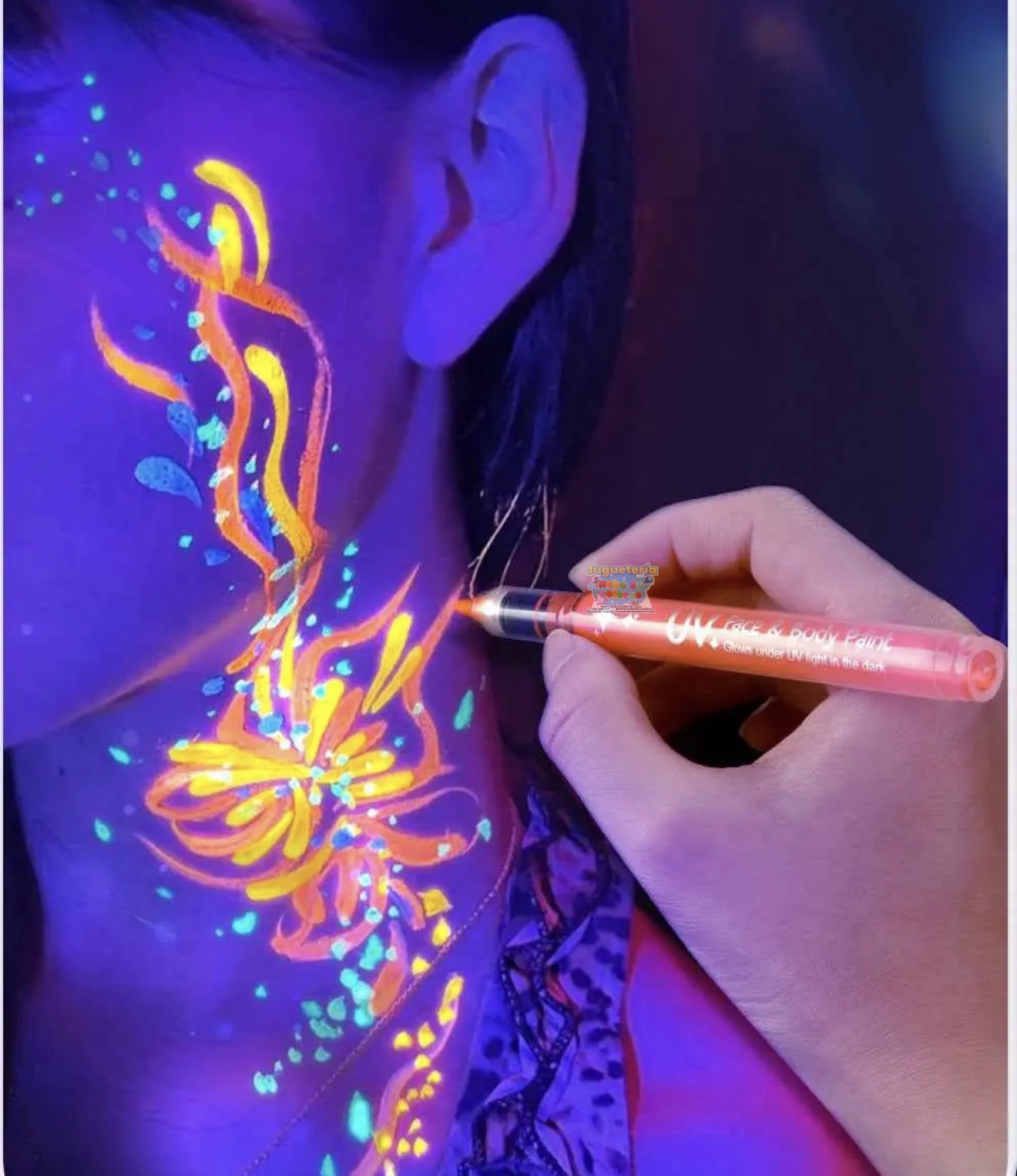 Set de pintura facial y corporal fluorescente que brilla bajo luz UV, ideal para que los niños exploren, creen y se transformen en la oscuridad 🌟🎨