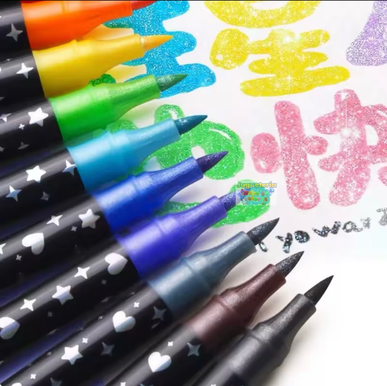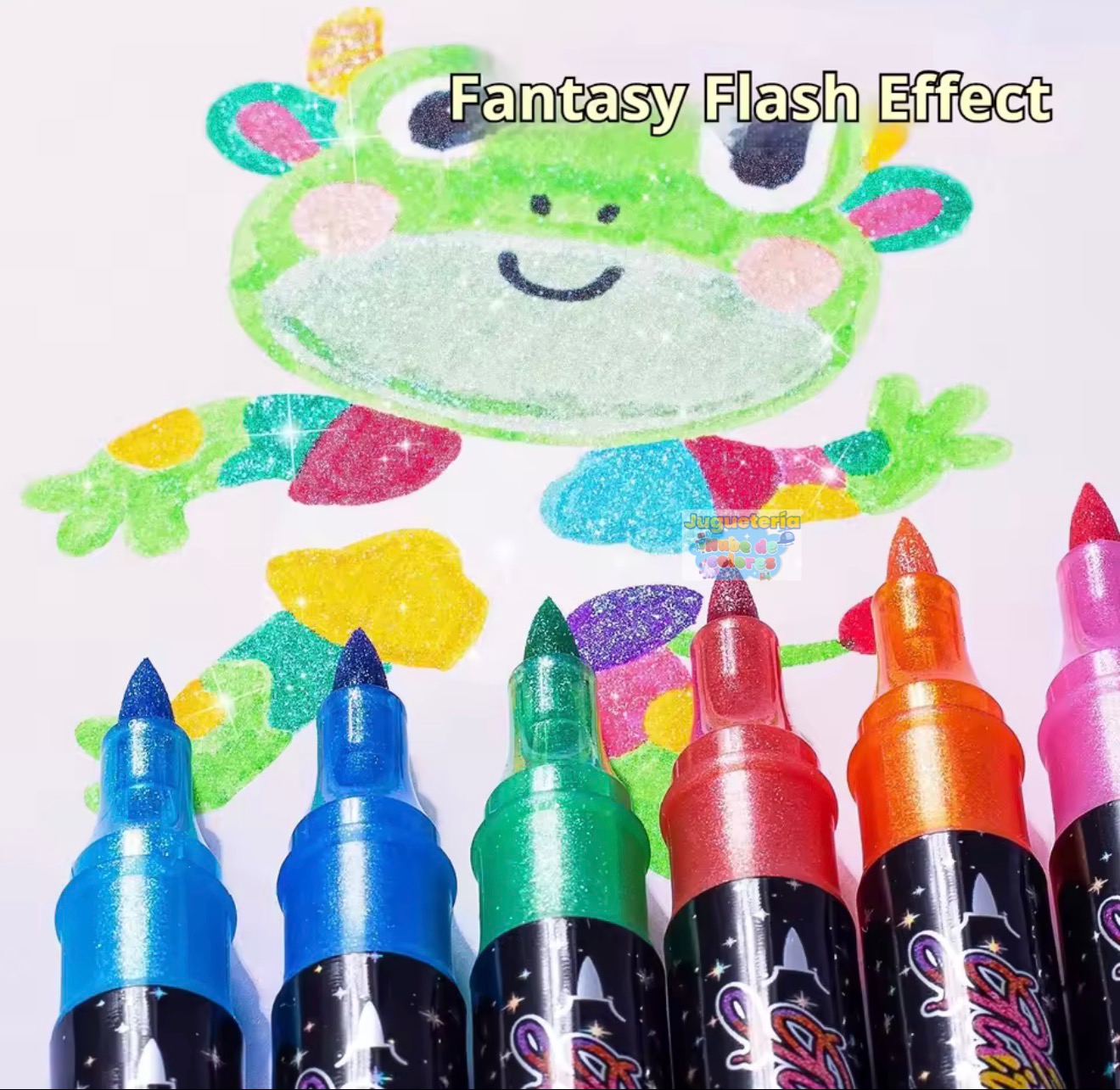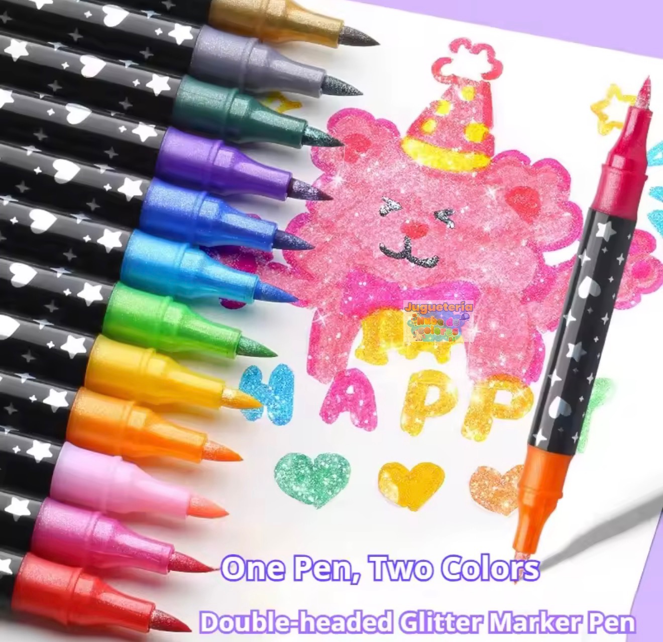 Set de marcadores glitter de doble punta, con efecto brillante y tinta de doble color, perfectos para dar un toque mágico a dibujos, lettering, manualidades y proyectos creativos. Cada marcador cuenta con dos puntas, permitiendo variar trazos y crear efectos únicos en una sola pasada.