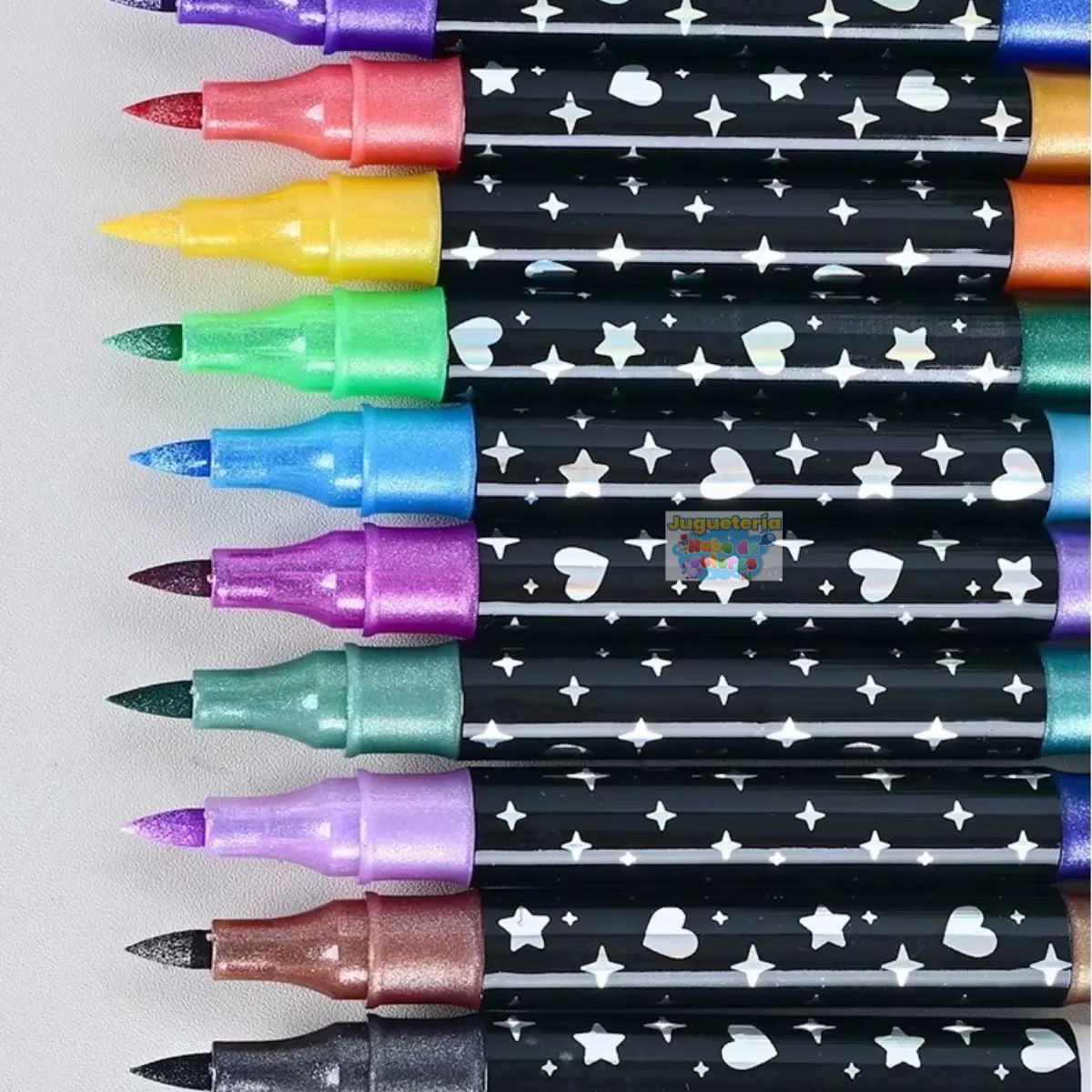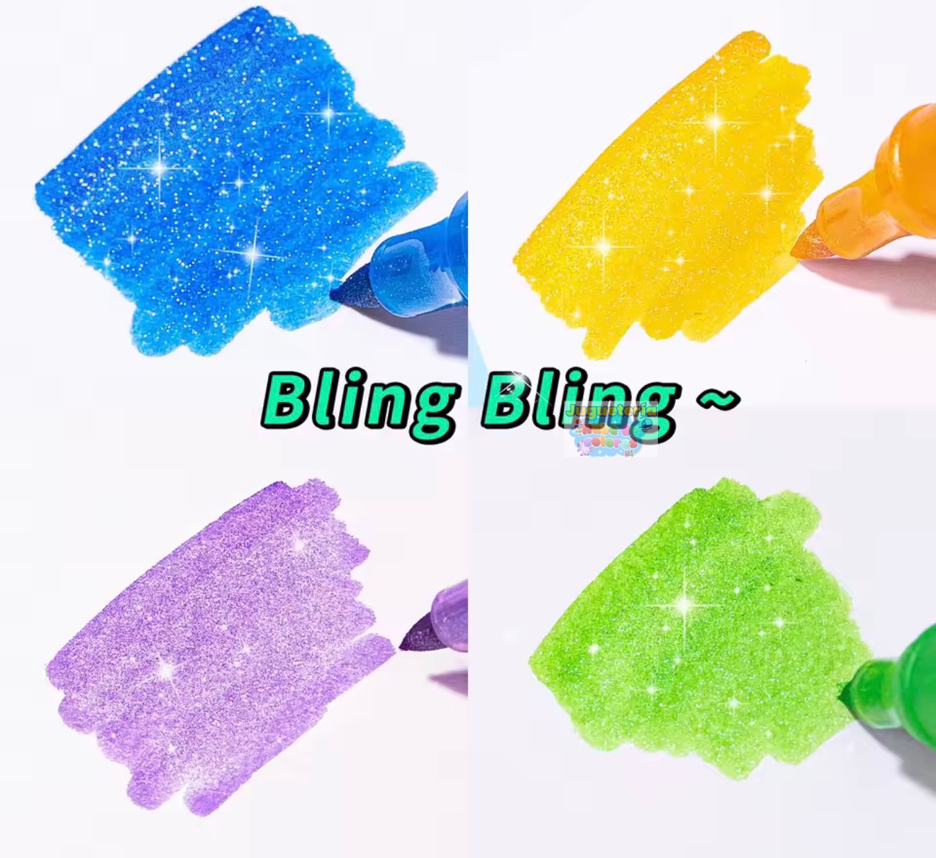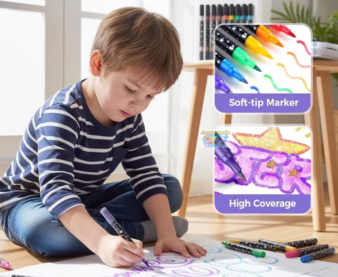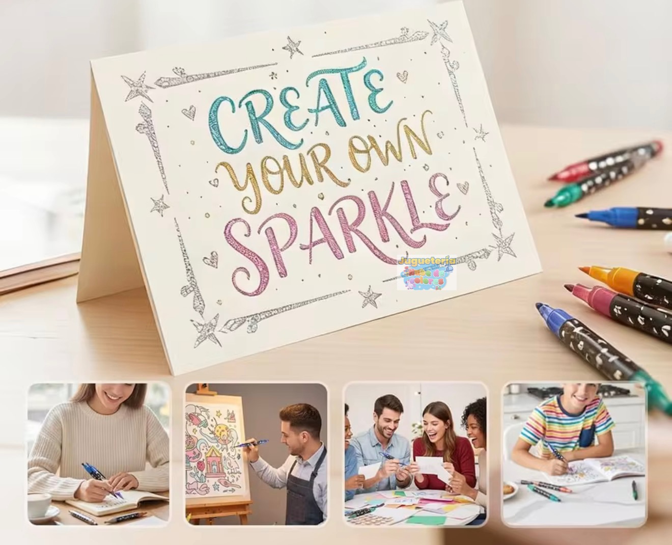 Set de marcadores glitter de doble punta, con efecto brillante y tinta de doble color, perfectos para dar un toque mágico a dibujos, lettering, manualidades y proyectos creativos. Cada marcador cuenta con dos puntas, permitiendo variar trazos y crear efectos únicos en una sola pasada.