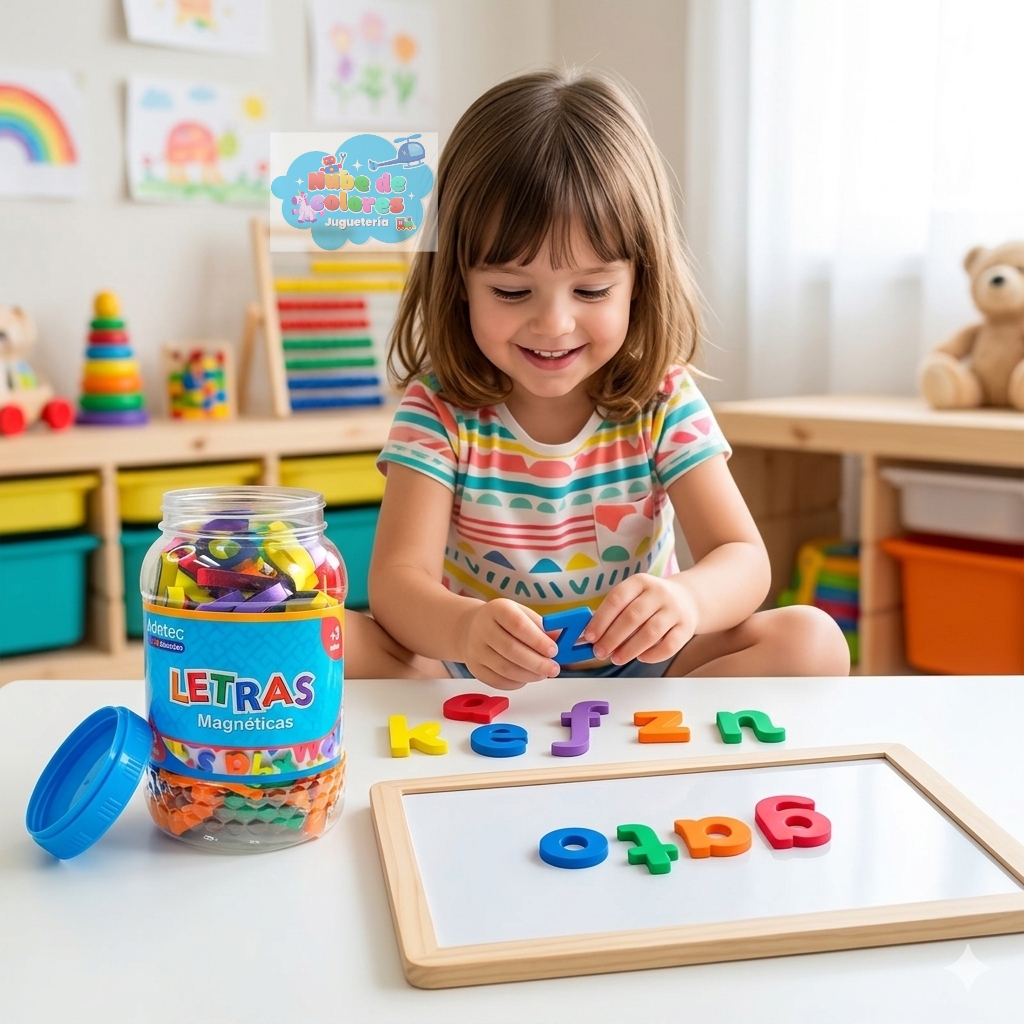 Es un material pedagógico compuesto por 88 piezas de letras plásticas que contienen imanes en su parte posterior. Estas letras están diseñadas en colores llamativos y son seguras (no tóxicas), recomendadas generalmente para niños de 3 años en adelante.