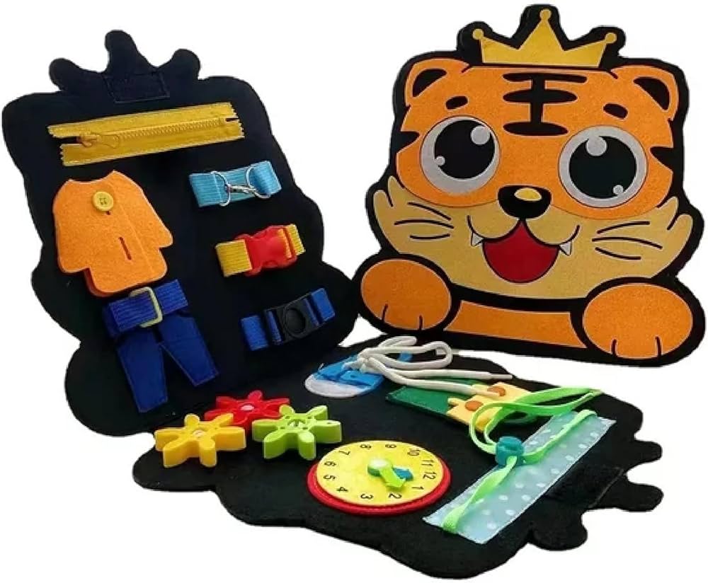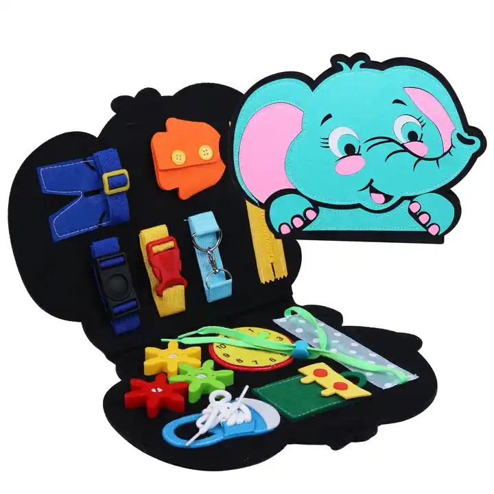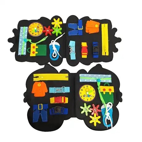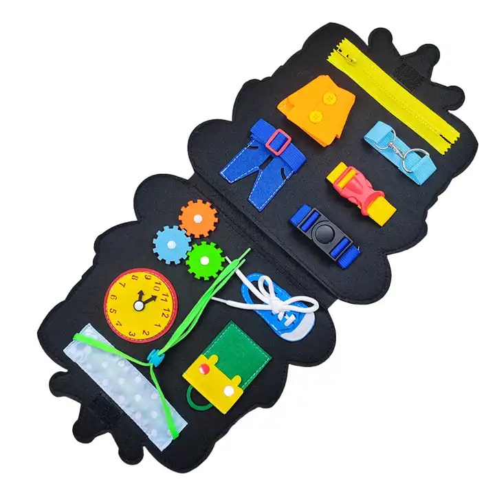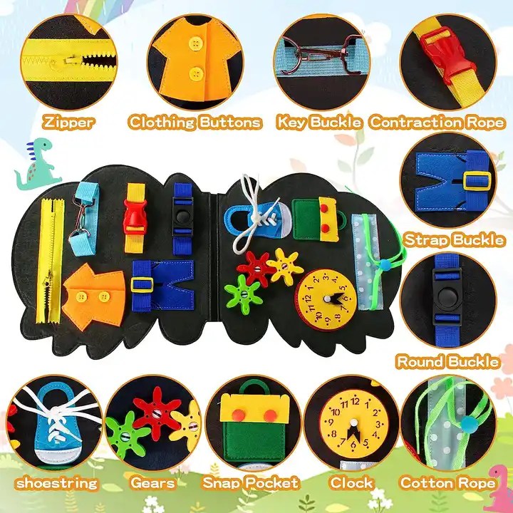 • Nuestro tablero de actividades presenta diferentes variedades de elementos como: hebillas, cierres, cordones de zapatos, botones de ropa, engranajes, reloj, etc. Adecuado para muchas escenas de la vida diaria, ayuda a los niños a aprender habilidades prácticas.