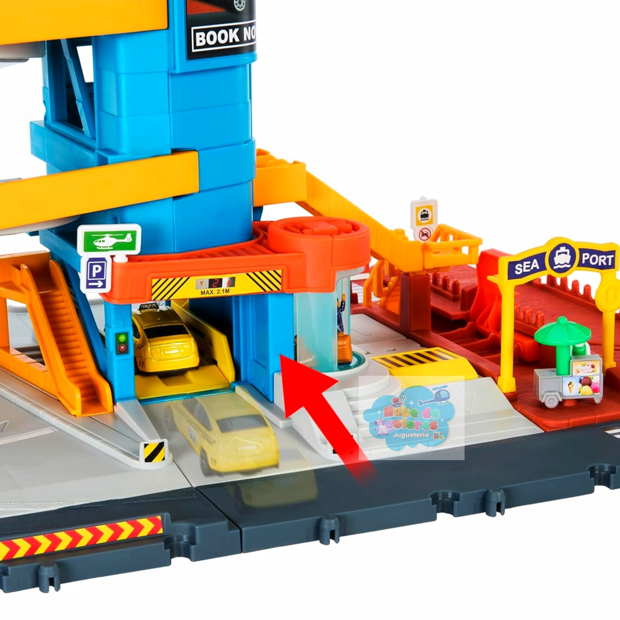El estacionamiento de 5 niveles incluye un ascensor para niños y puertas para contar historias dinámicas. También se puede utilizar para almacenamiento, con capacidad para hasta 12 vehículos. Se incluyen un coche, barco y helicóptero.