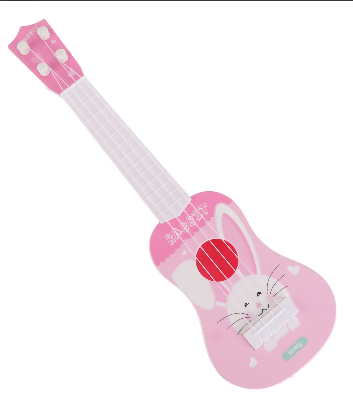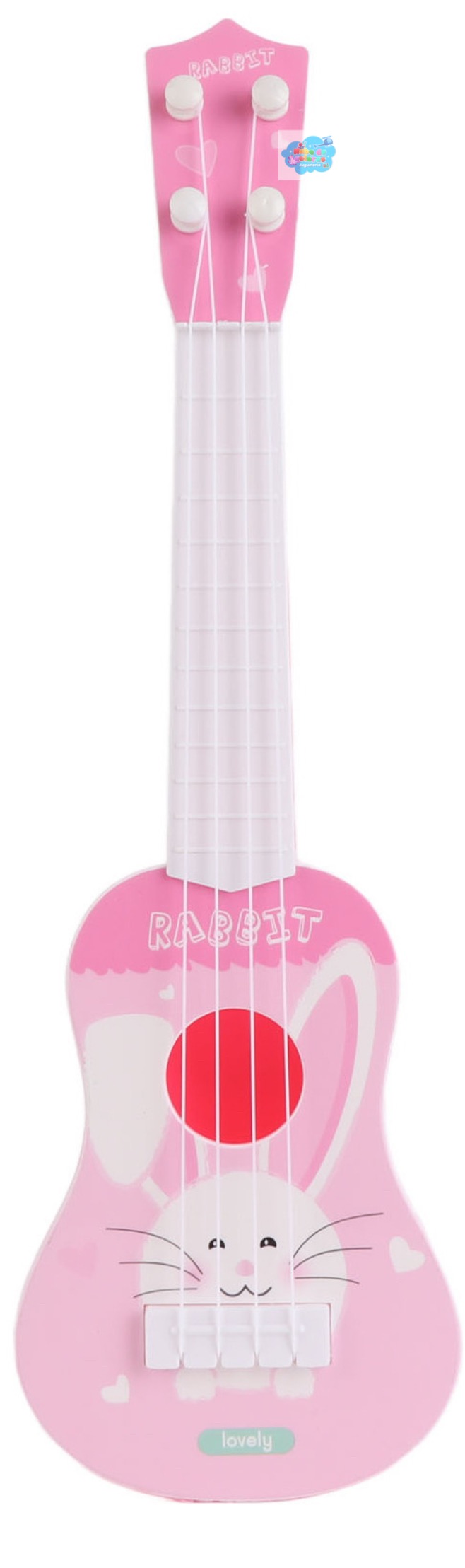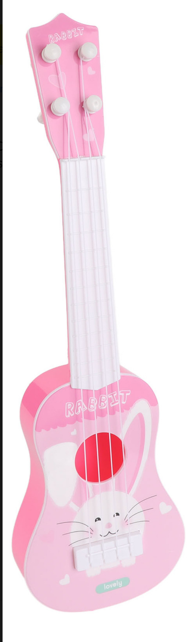 Diseño y color:Es una mini guitarra de juguete de color rosa, con ilustraciones de un conejo, celeste con cebra y celeste cerdito.