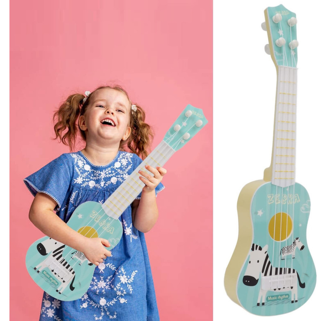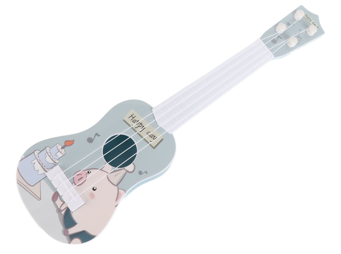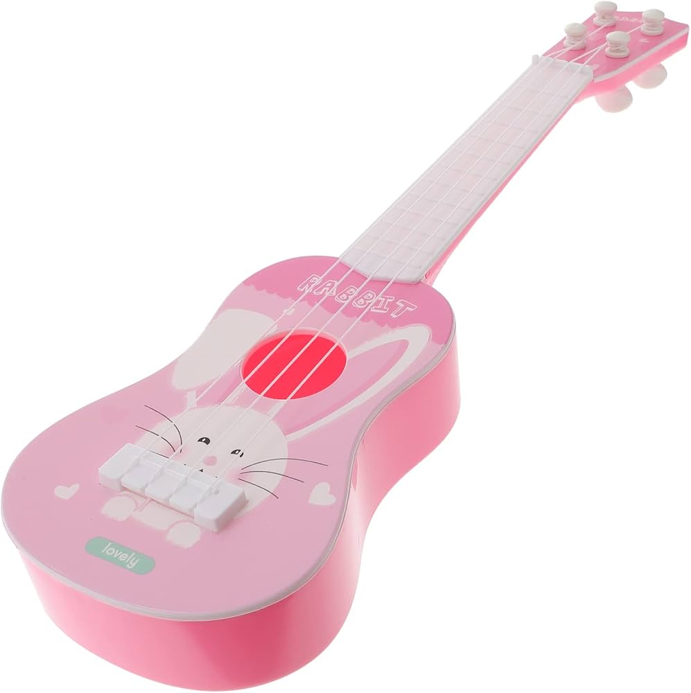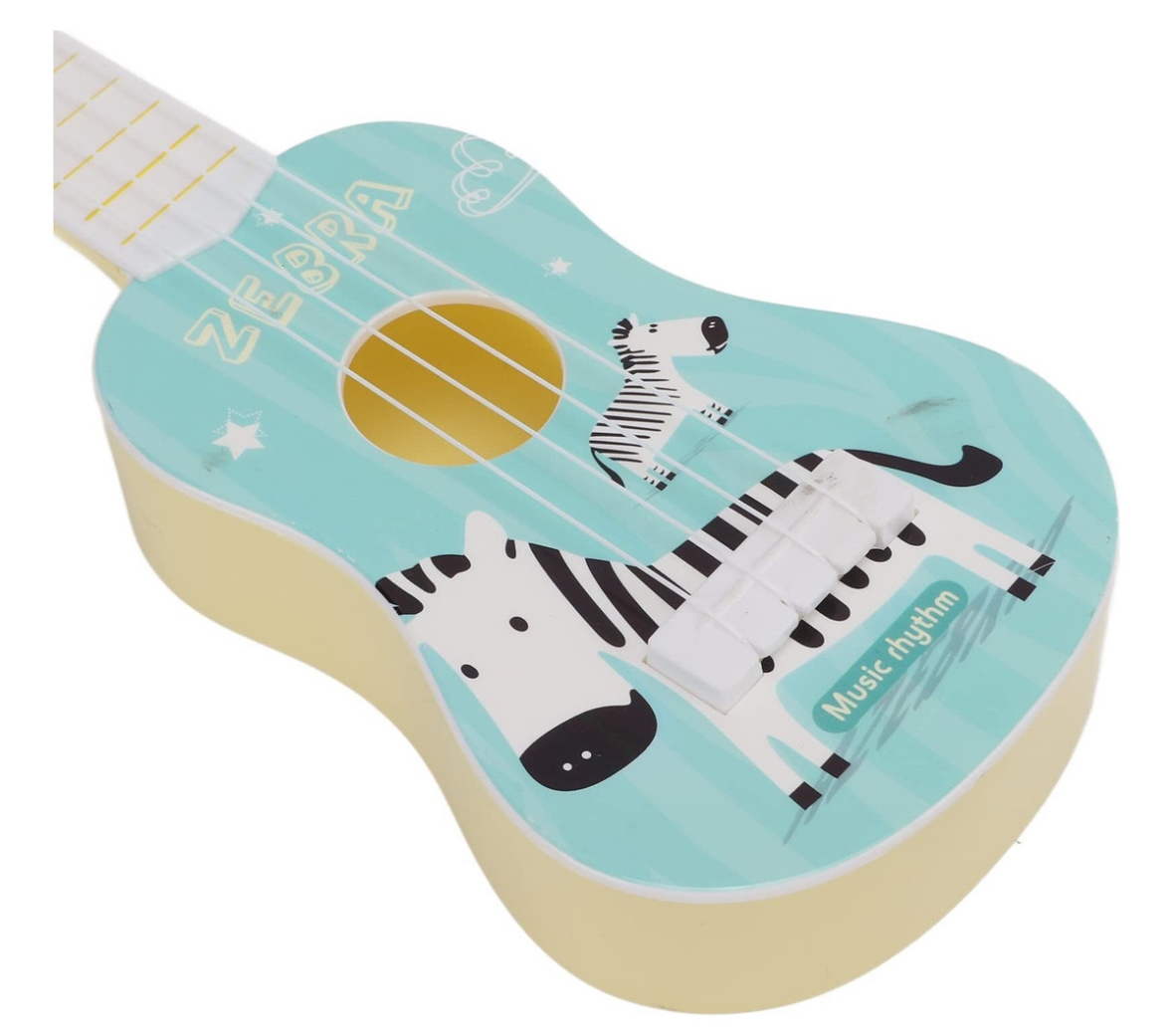 Diseño y color:Es una mini guitarra de juguete de color rosa, con ilustraciones de un conejo, celeste con cebra y celeste cerdito.