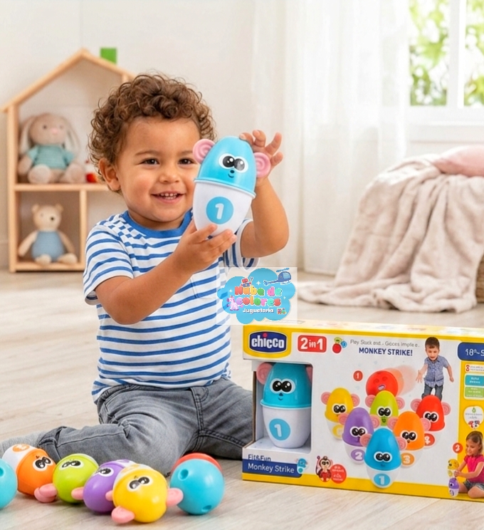 • Juego de Bolos: Incluye 6 bolos coloridos con caras de monos y una bola roja de material blando. Los niños deben lanzar la bola para intentar derribar los bolos.