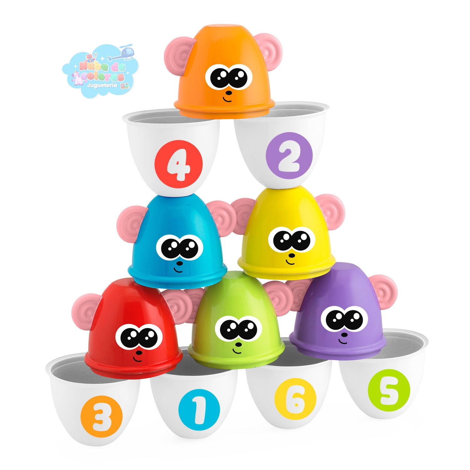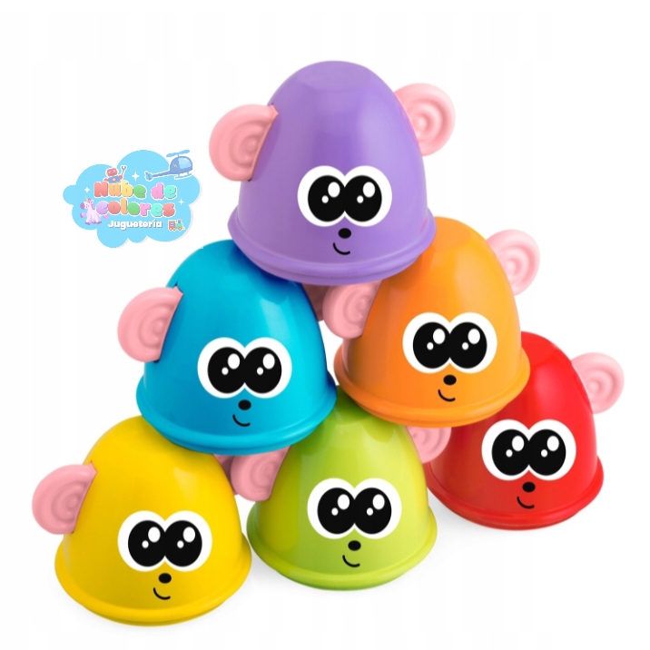 • Juego de Apilamiento: Cada bolo se divide por la mitad, creando un total de 12 piezas intercambiables. Estas piezas se pueden apilar para construir torres o pirámides de colores, estimulando la creatividad.