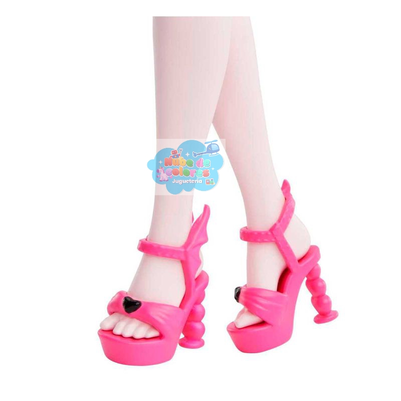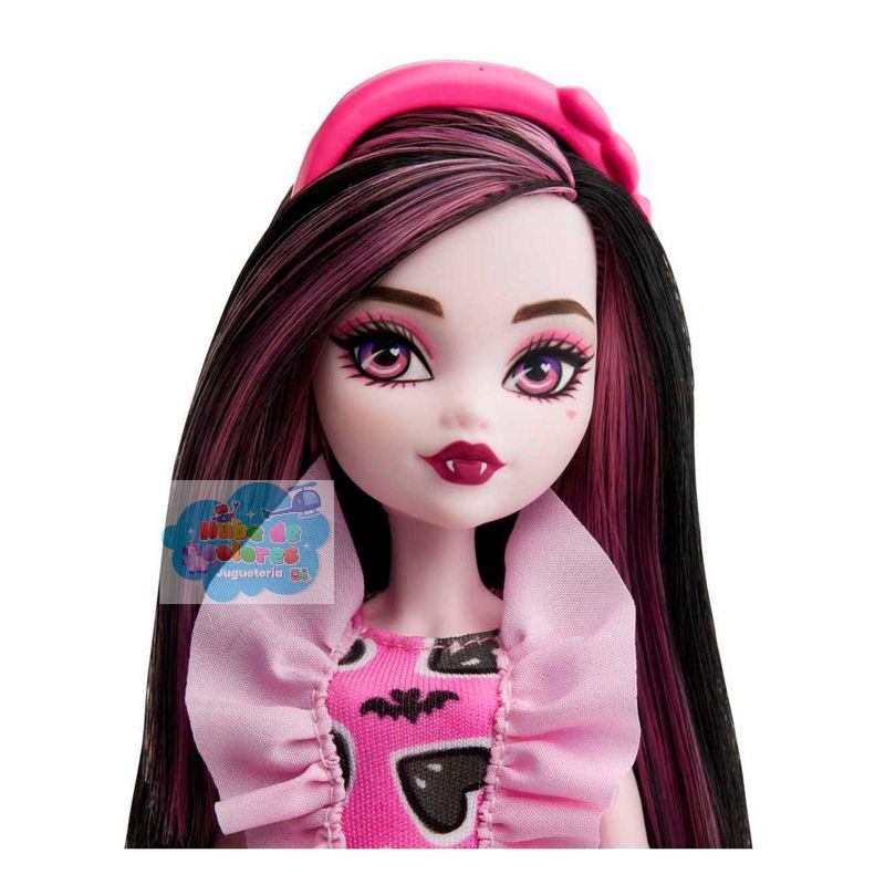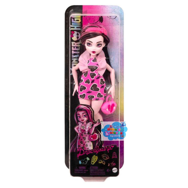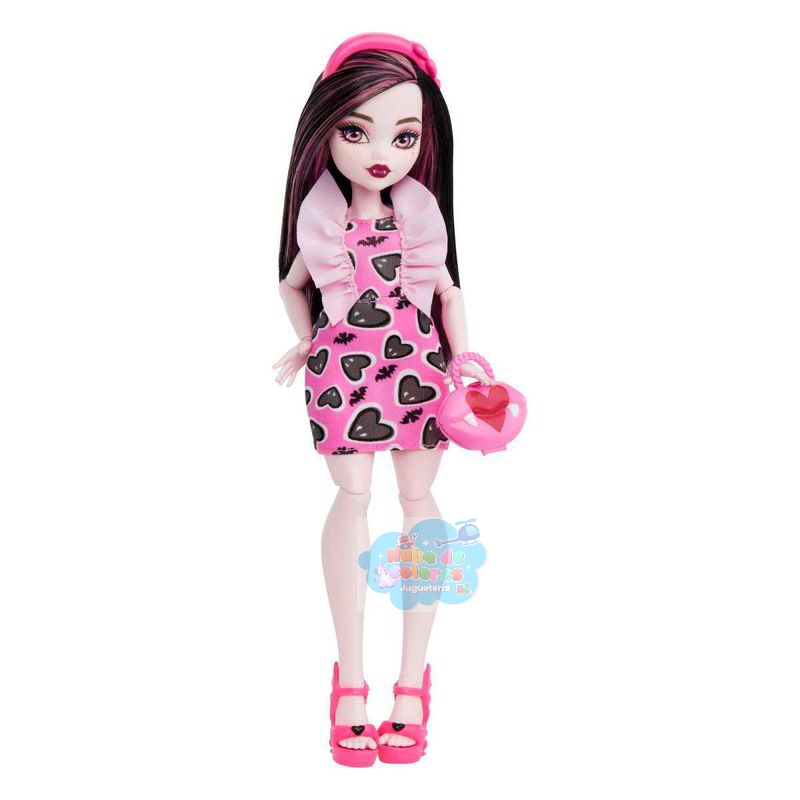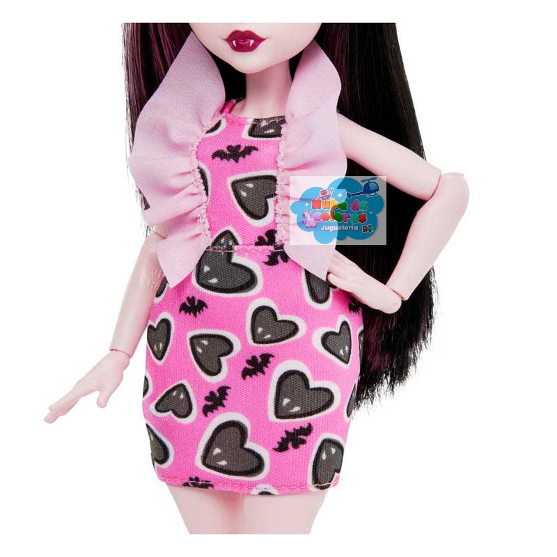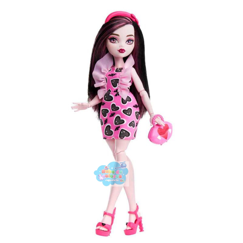Esta muñeca, inspirada en Draculaura de Monster High, presenta un estilo vampírico a la moda con un vestido rosa y negro con estampado de corazones, un bolso a juego y accesorios elegantes.