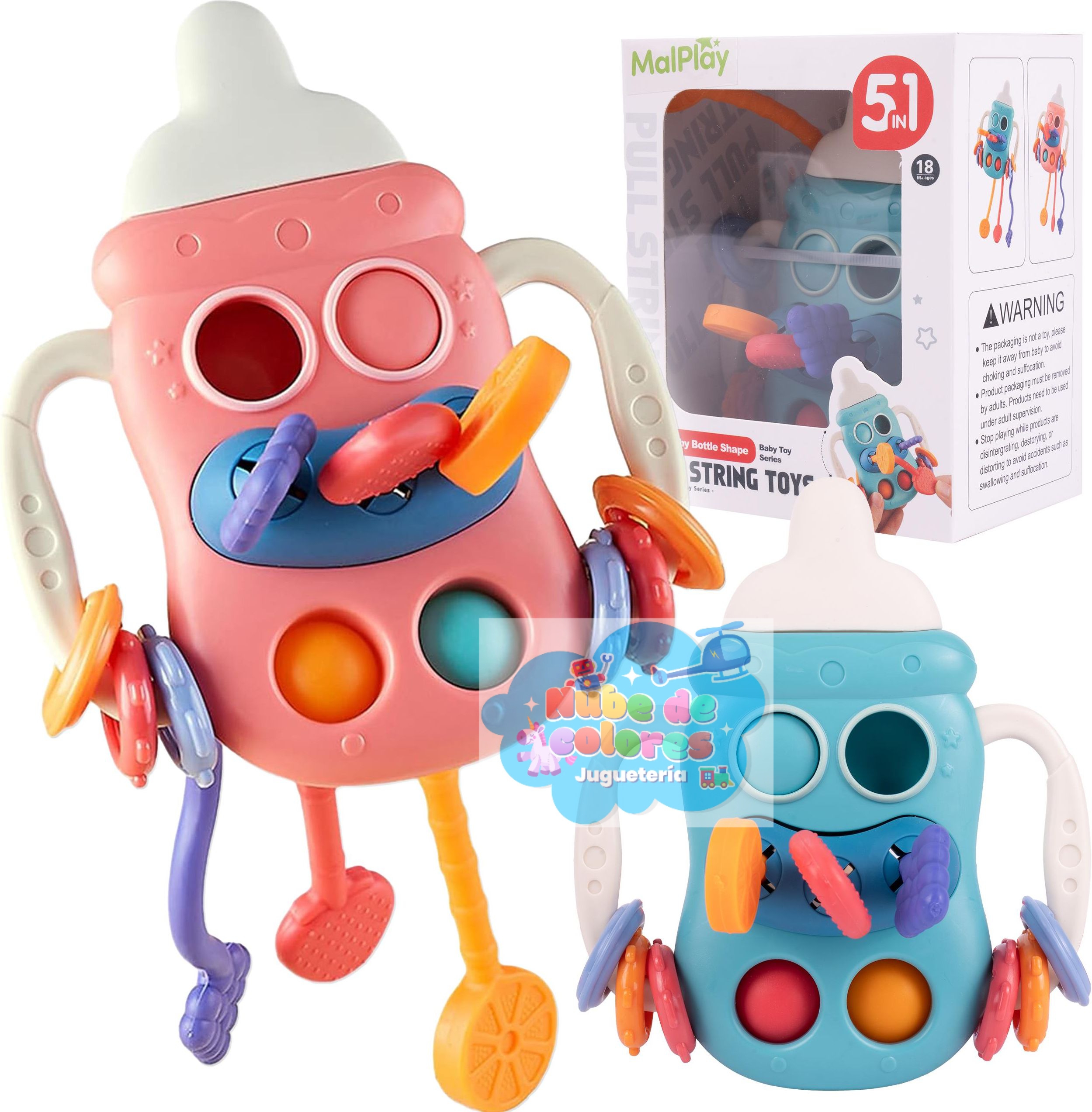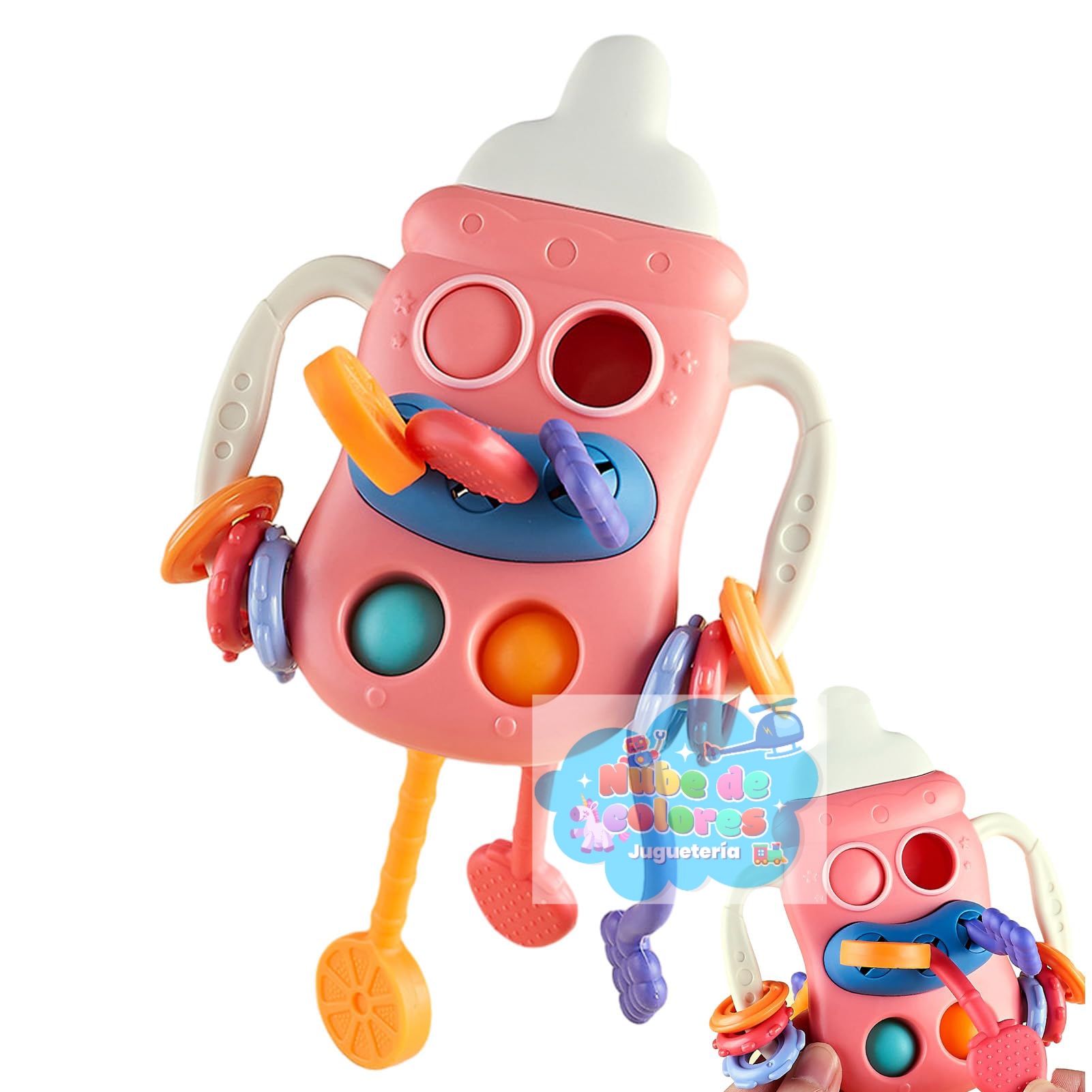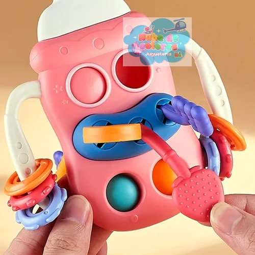 Este es un juguete sensorial para bebés de la marca Bibi-irn, diseñado con forma de biberón, que incluye múltiples texturas y cuerdas para estimular los sentidos y la motricidad del bebé.