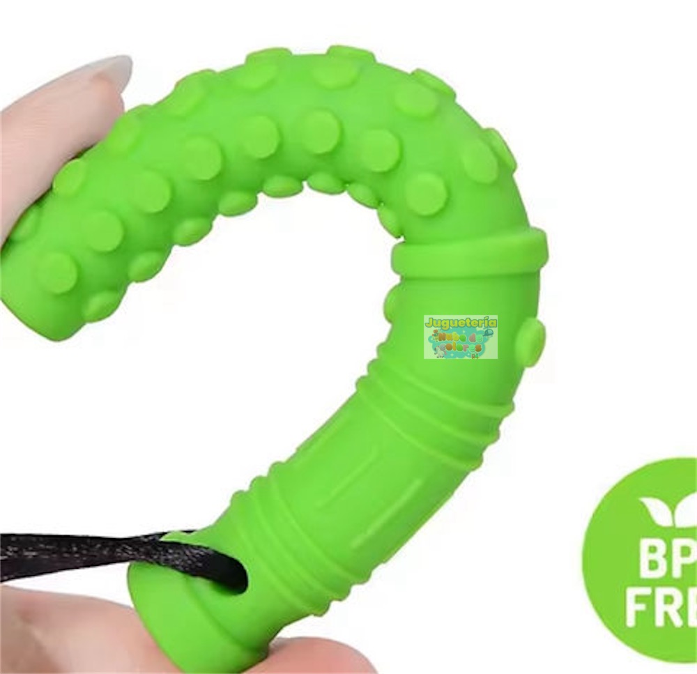 Su forma alargada permite morder en distintos puntos, mientras su textura con relieves entrega estimulación táctil adicional.