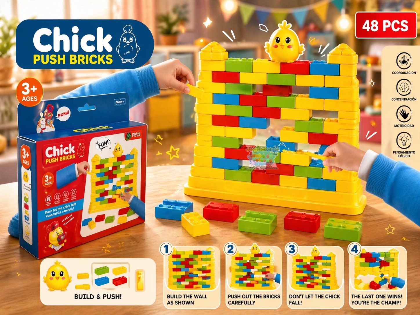 Un juego entretenido y desafiante donde los niños deben empujar los bloques con cuidado sin botar la estructura… ¡y sin que el pollito caiga! 😱🎯