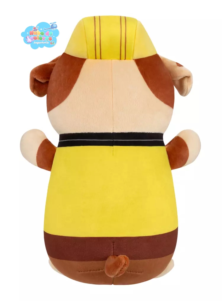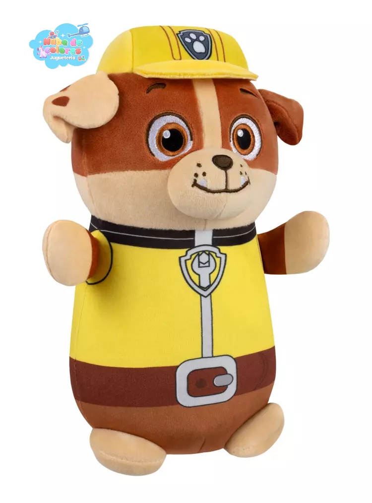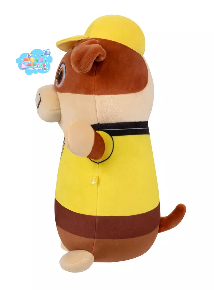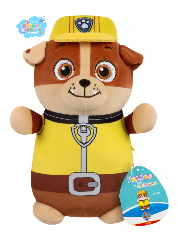 Peluche coleccionable de la marca Squishmallows, específicamente el modelo HugMees del personaje Rubble de la serie animada Paw Patrol (Patrulla Canina).