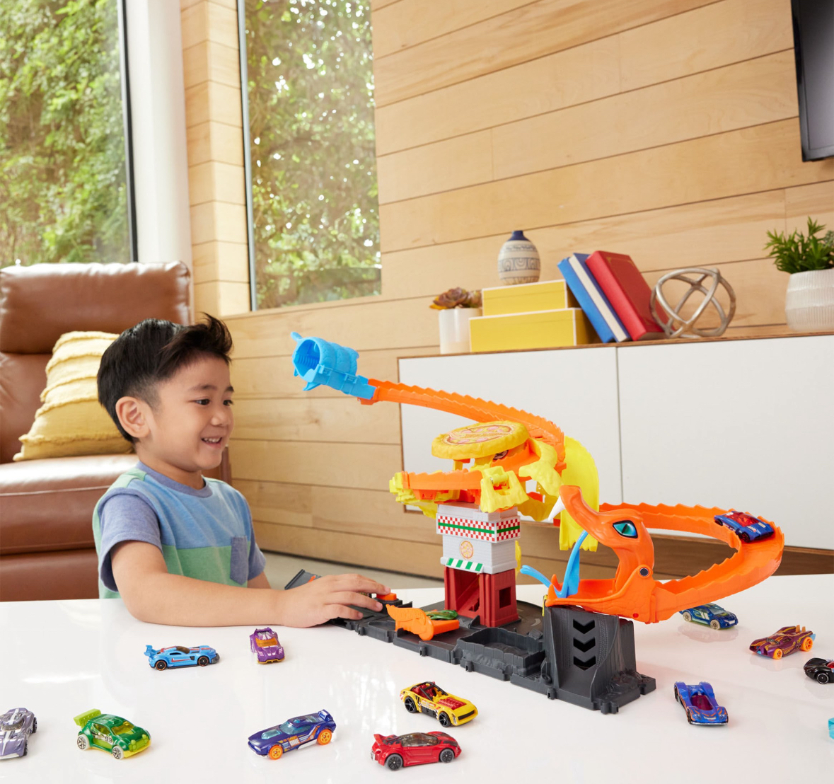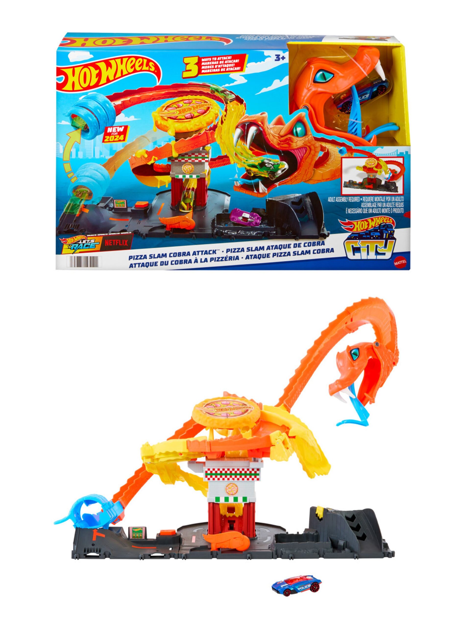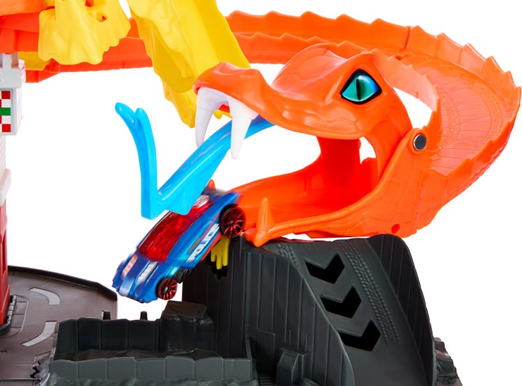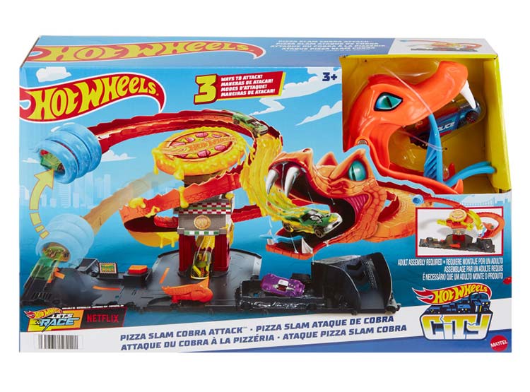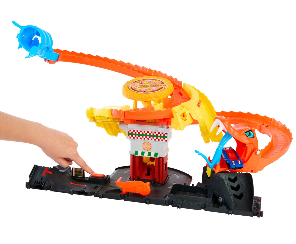 PISTA DE JUGUETE. Con este increíble juguete para niños, salva la pizzería de Hot Wheels City de una enorme cobra que se ha apoderado de ella. Conéctalo a otros sets Hot Wheels y Matchbox para jugar por horas y vivir aventuras sin límites