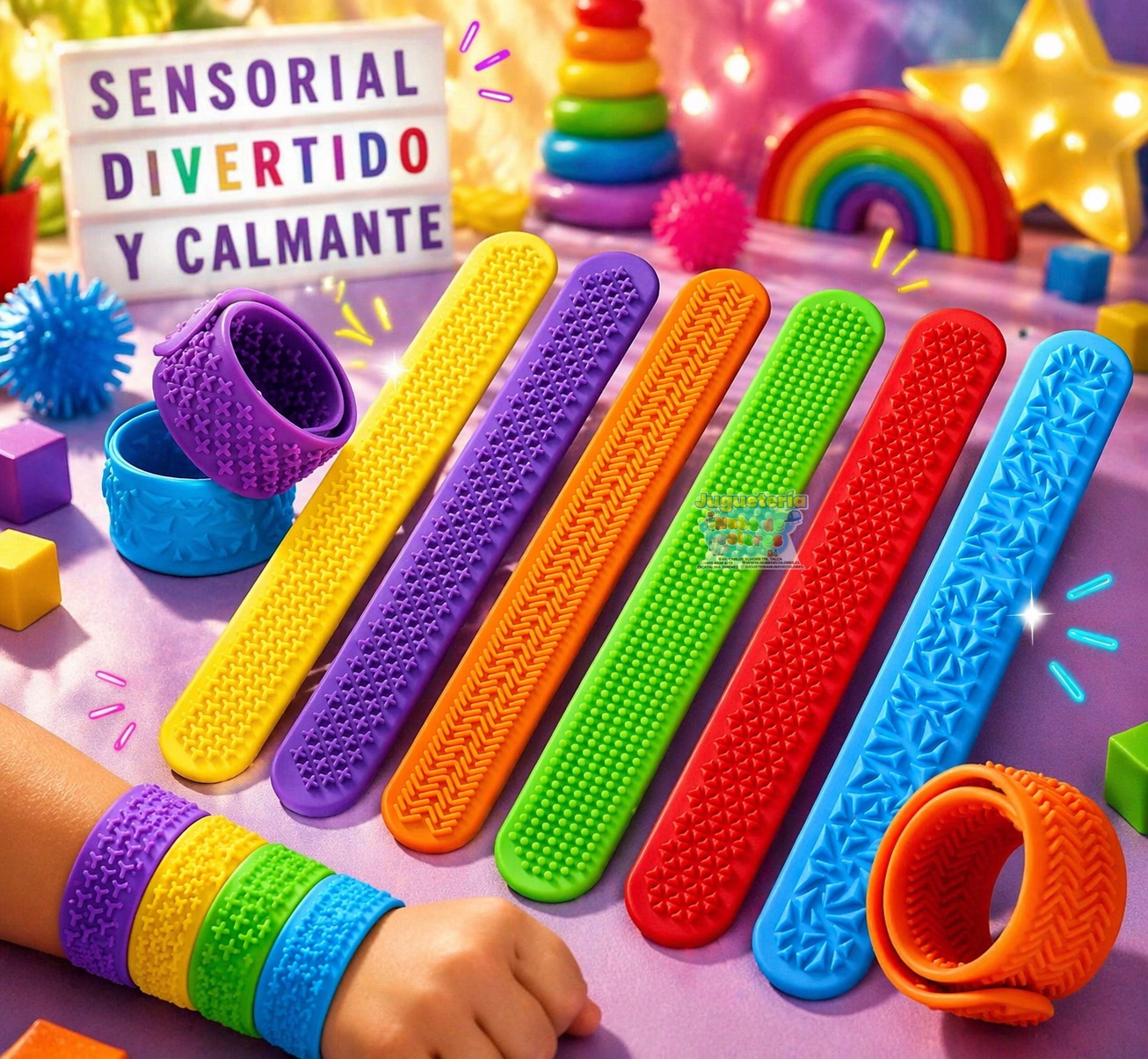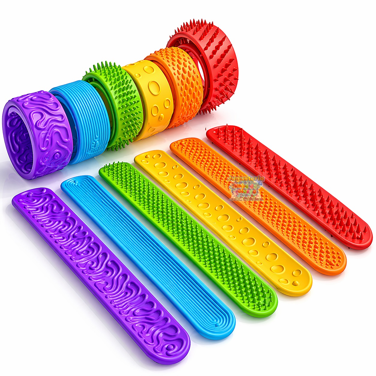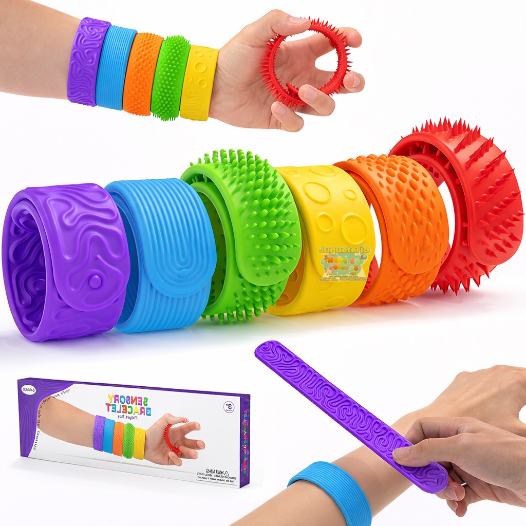 Son pulseras sensoriales con diferentes texturas, diseñadas para que los niños las usen en la muñeca o las manipulen con las manos.