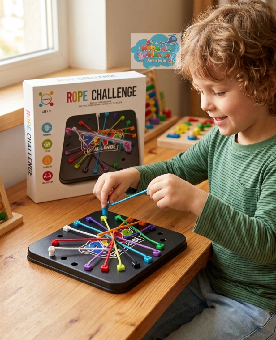 Rope Challenge es un juego de mesa de lógica y estrategia diseñado para estimular el pensamiento crítico, la concentración y las habilidades motoras finas.