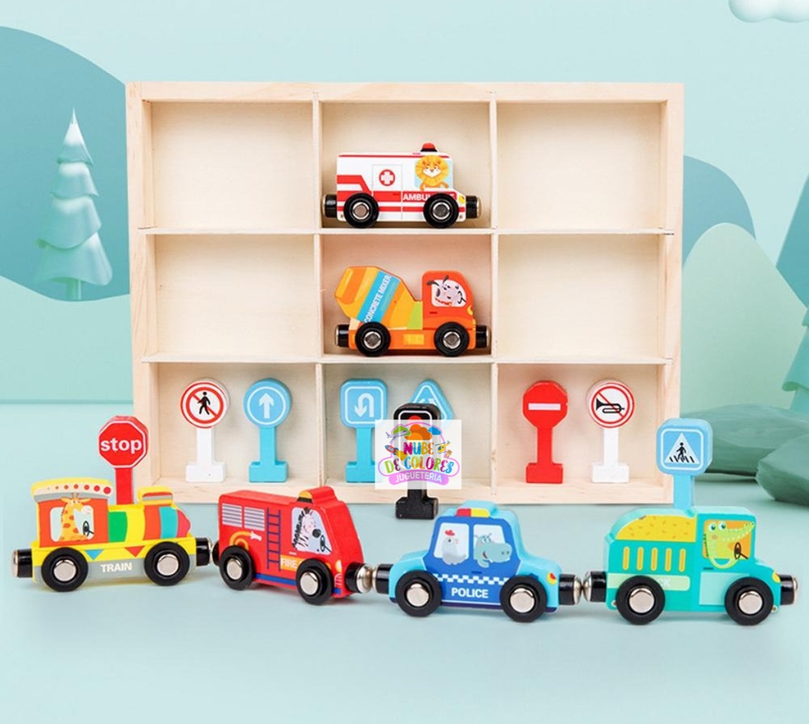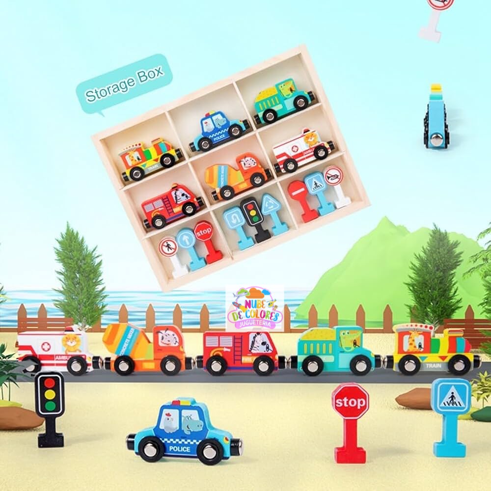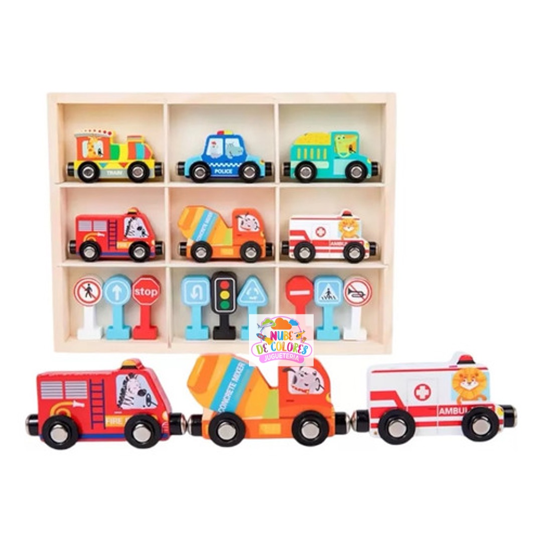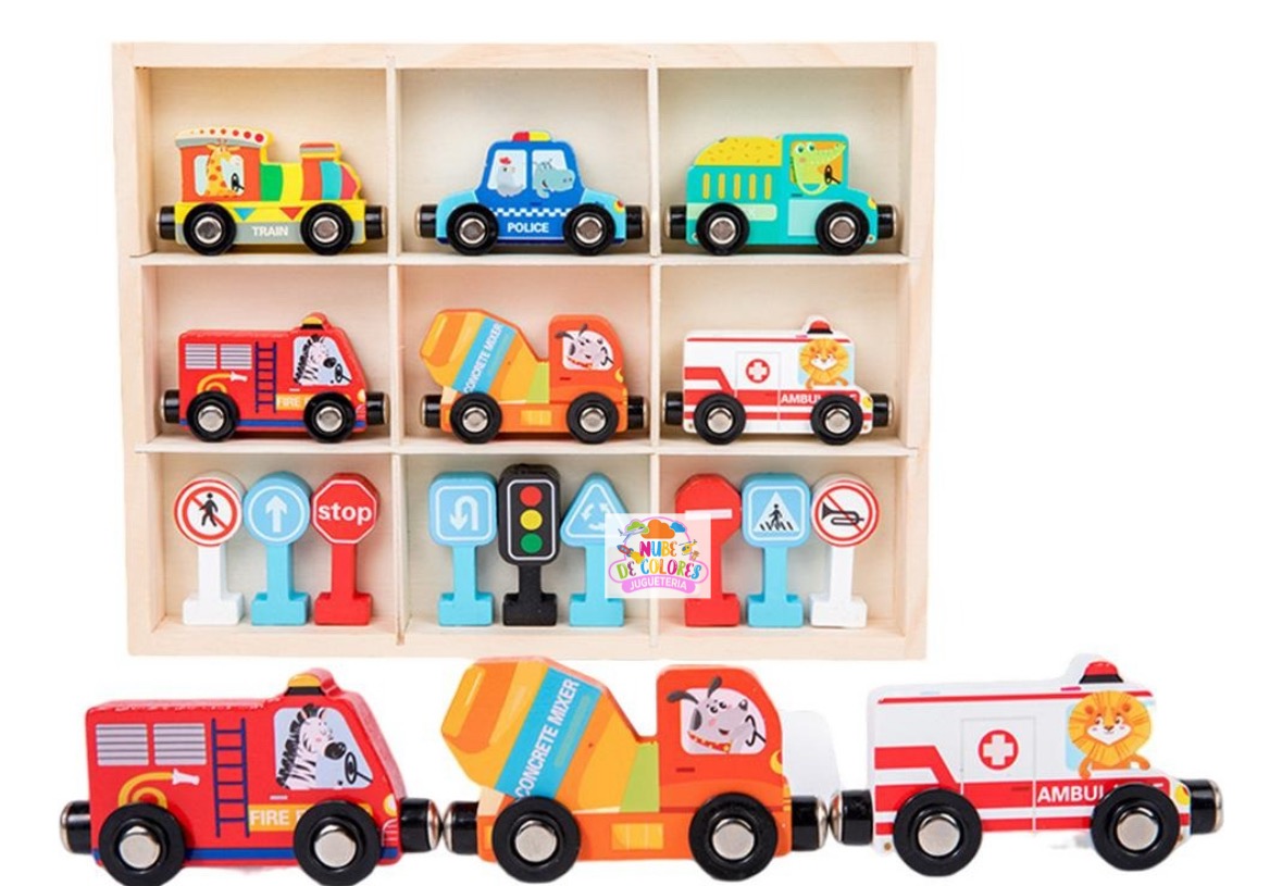 Set de Vehículos de Madera con Imanes, Señales de Tránsito y Caja Organizadora | Juguete Educativo Didáctico Este completo y colorido set de vehículos de madera con señales de tránsito es mucho más que un simple juguete. Es una herramienta didáctica ideal para el aprendizaje temprano de normas viales, estimulación sensorial y desarrollo de habilidades motoras en niños. Su presentación en una caja organizadora de madera lo convierte en un producto práctico, ordenado y visualmente atractivo, perfecto para regalar o incorporar en el hogar o en establecimientos educativos. Características del producto Este set incluye: Seis vehículos de madera con imanes que permiten conectarlos entre sí: Tren Patrulla de policía Bus escolar Camión de bomberos Camión mezclador de cemento Ambulancia Nueve señales de tránsito en 3D con base estable, que representan: Señal de alto (STOP) Paso de peatones Sentido obligatorio Semáforo Prohibido pasar Curvas peligrosas, entre otras Caja organizadora de madera con 9 compartimentos, diseñada para mantener el orden y facilitar el guardado de las piezas.