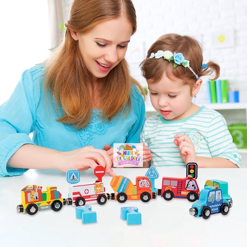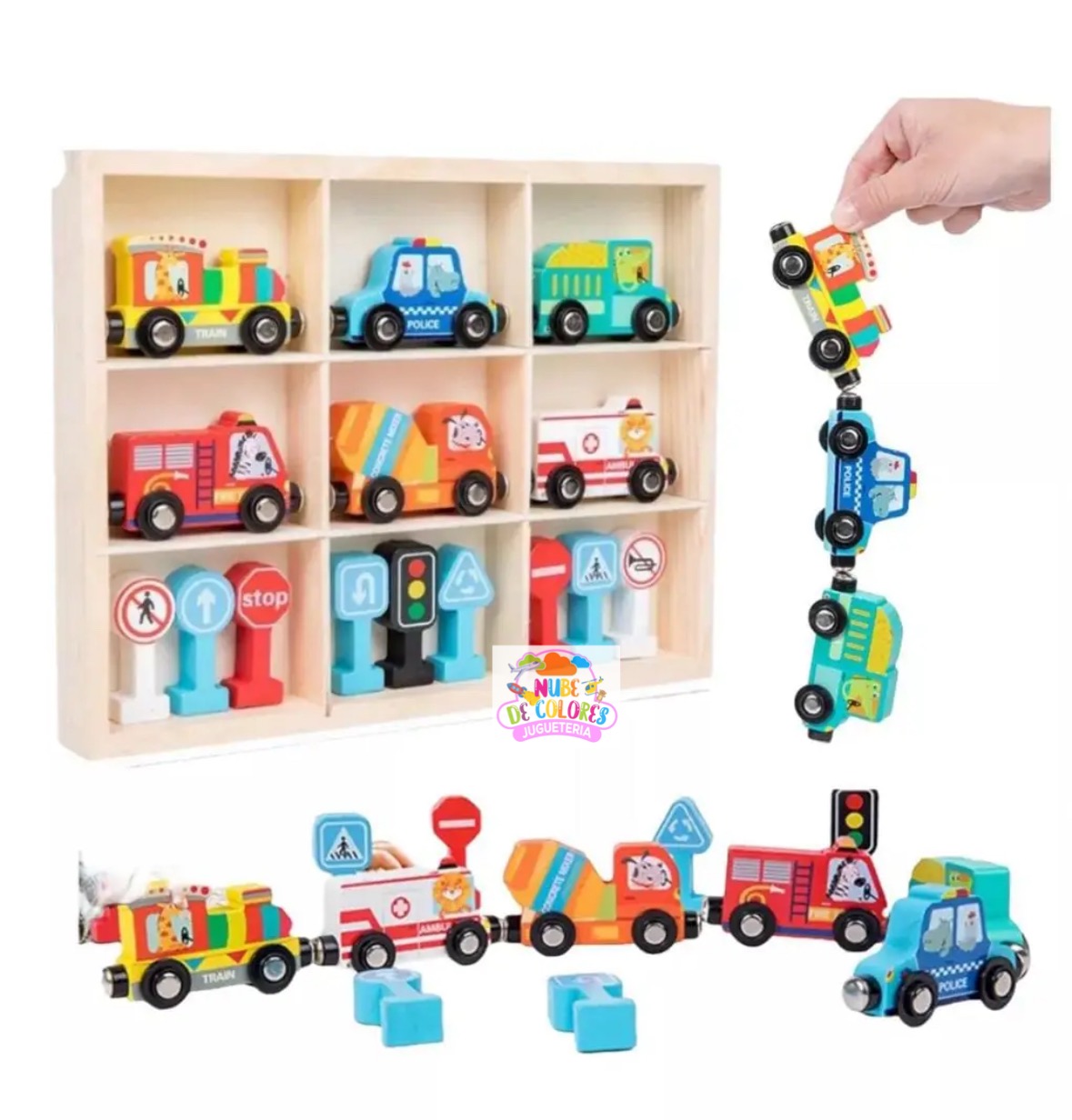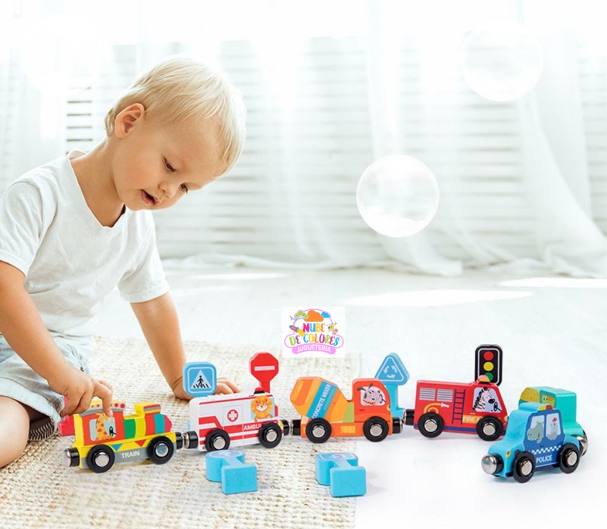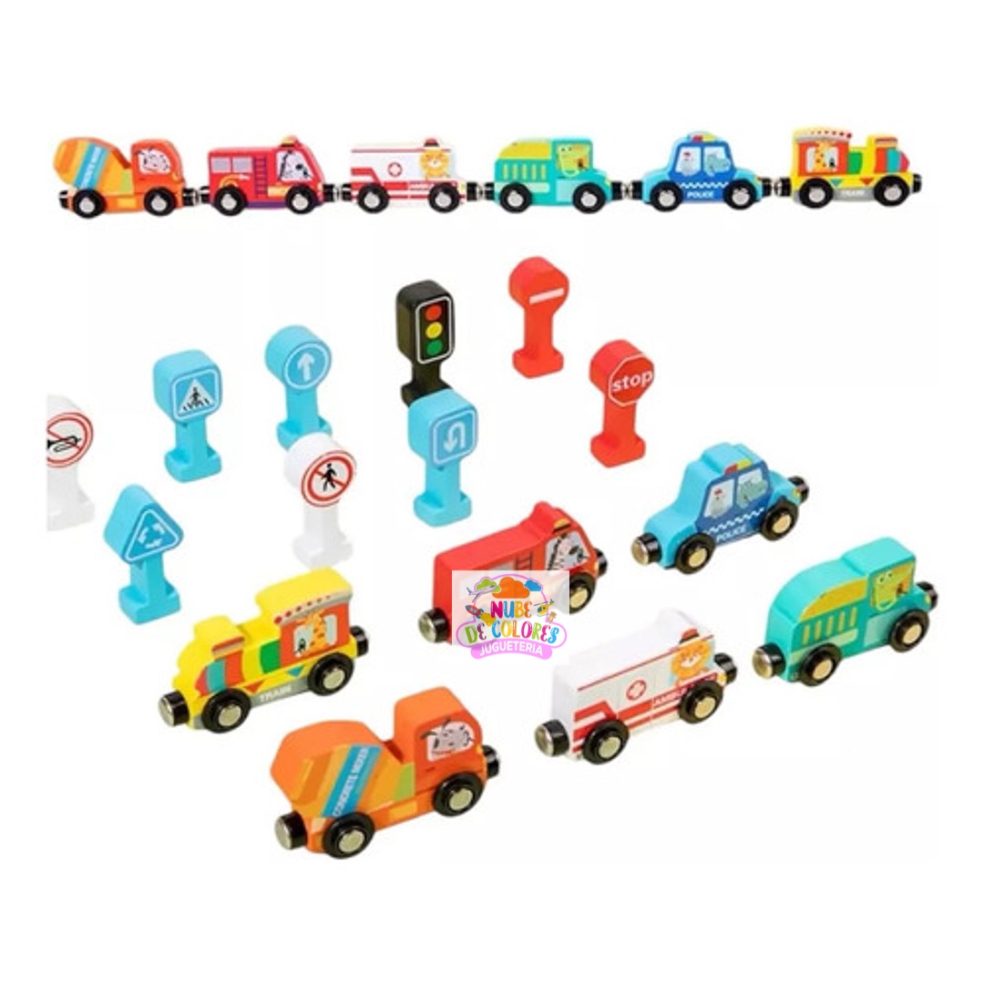 Set de Vehículos de Madera con Imanes, Señales de Tránsito y Caja Organizadora | Juguete Educativo Didáctico Este completo y colorido set de vehículos de madera con señales de tránsito es mucho más que un simple juguete. Es una herramienta didáctica ideal para el aprendizaje temprano de normas viales, estimulación sensorial y desarrollo de habilidades motoras en niños. Su presentación en una caja organizadora de madera lo convierte en un producto práctico, ordenado y visualmente atractivo, perfecto para regalar o incorporar en el hogar o en establecimientos educativos. Características del producto Este set incluye: Seis vehículos de madera con imanes que permiten conectarlos entre sí: Tren Patrulla de policía Bus escolar Camión de bomberos Camión mezclador de cemento Ambulancia Nueve señales de tránsito en 3D con base estable, que representan: Señal de alto (STOP) Paso de peatones Sentido obligatorio Semáforo Prohibido pasar Curvas peligrosas, entre otras Caja organizadora de madera con 9 compartimentos, diseñada para mantener el orden y facilitar el guardado de las piezas.