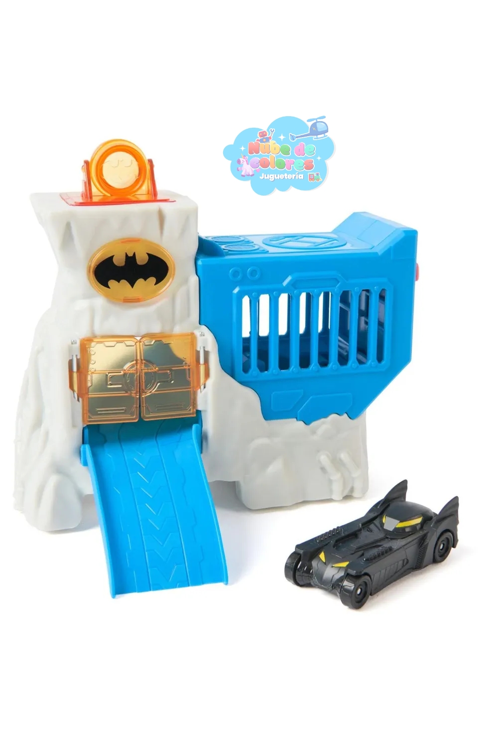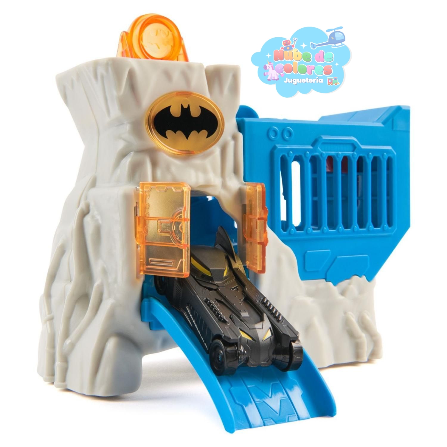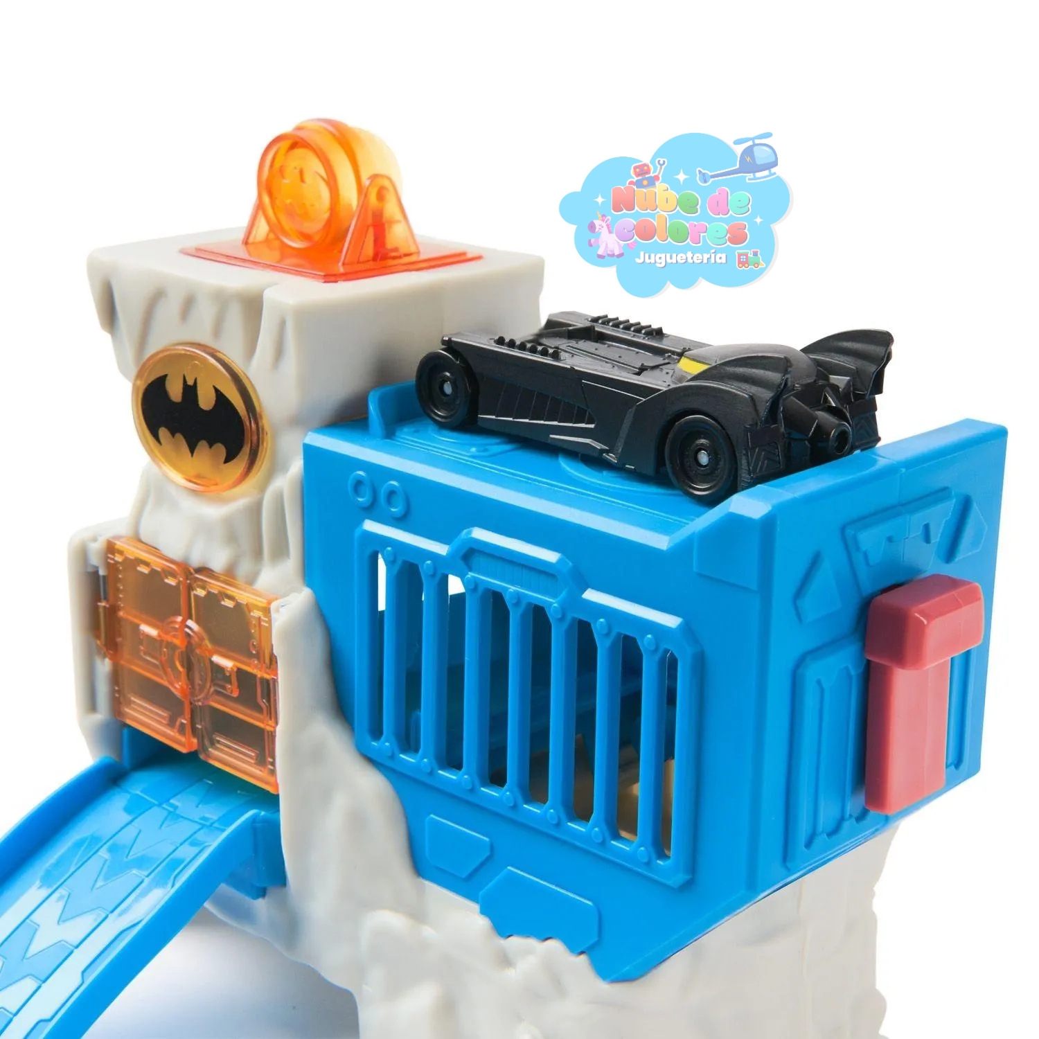 • Rampa y acción: Cuenta con una rampa o pista azul que permite que el Batimóvil descienda a toda velocidad. Un botón lateral libera el vehículo desde un escondite secreto para simular una salida rápida en misiones.