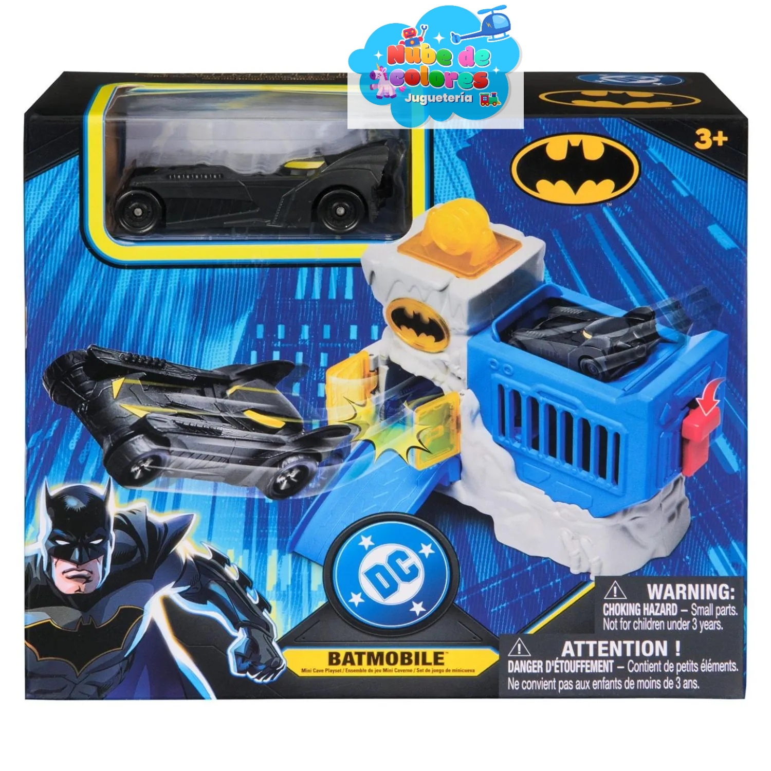 Playset Mini Batcaverna de Batman que incluye un Batimóvil. Es un set de juego diseñado para que los niños recreen aventuras del Caballero Oscuro.