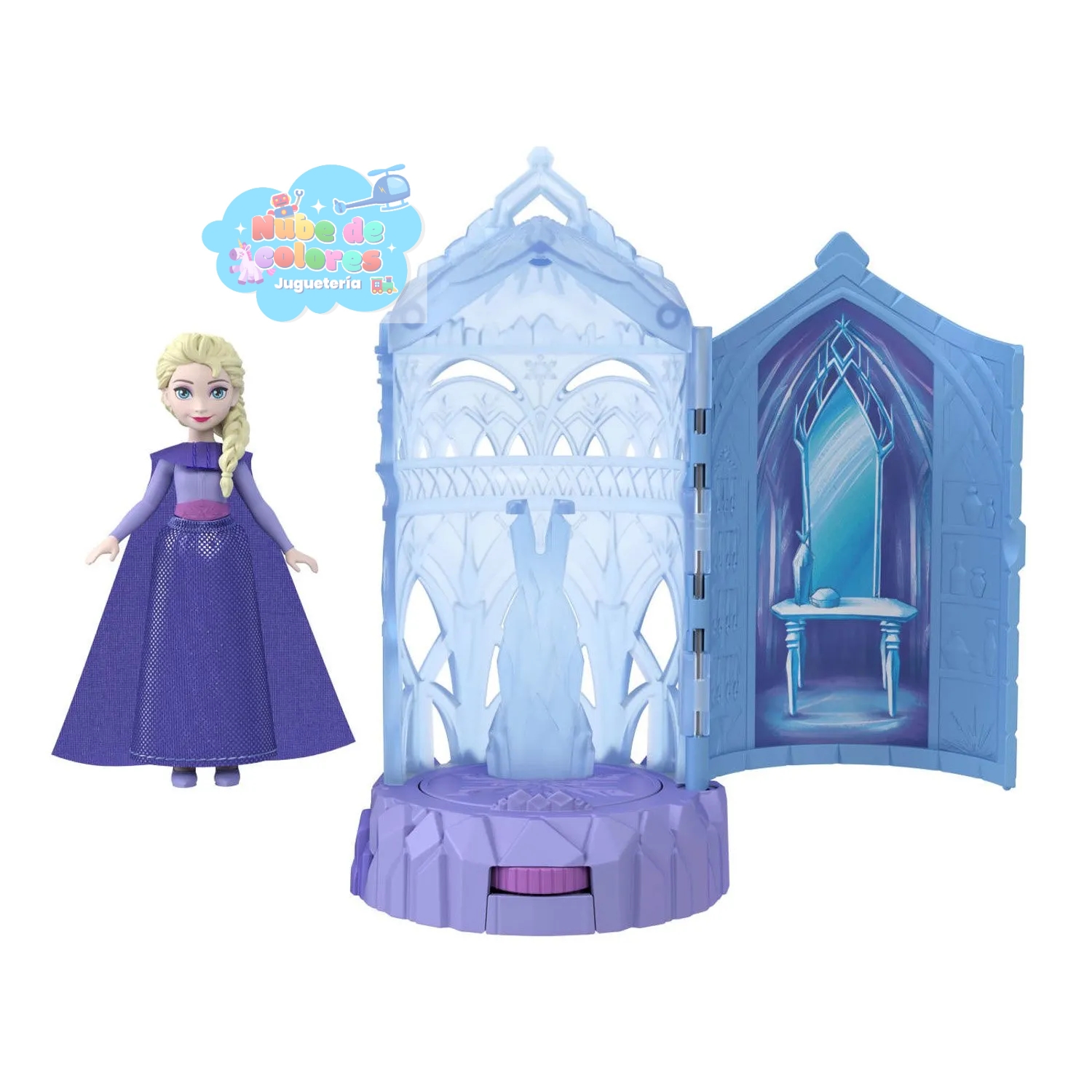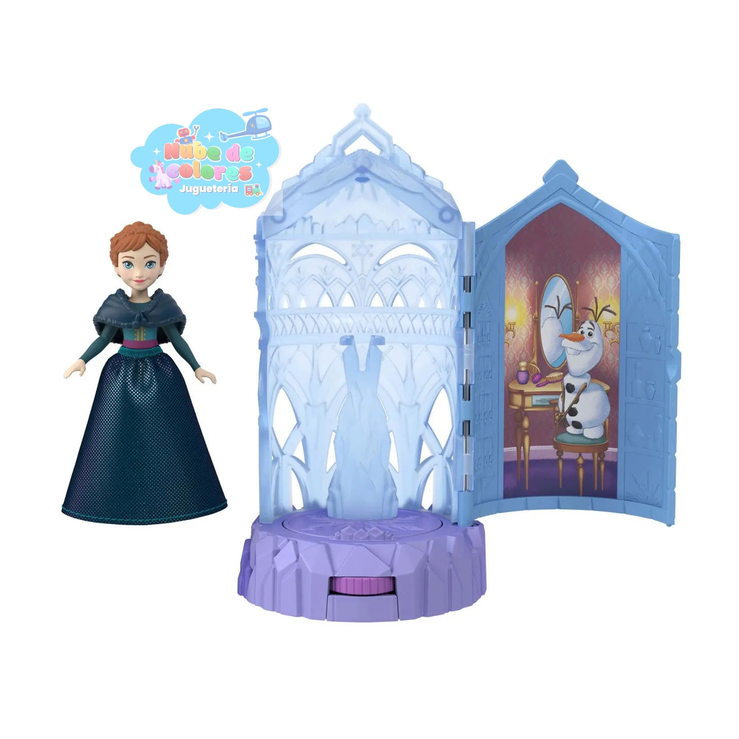 - Función de giro: Al abrir la puerta del minicastillo o girar una rueda, el interior gira para revelar una pequeña muñeca articulada sorpresa de un personaje de Frozen, como Anna o Elsa.