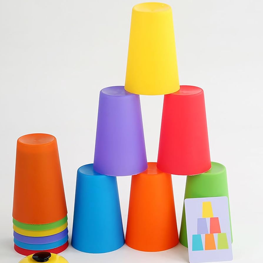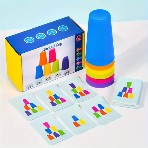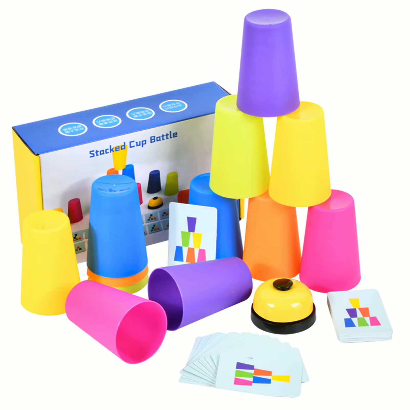 ¡Demuestra tus habilidades a tus amigos! Objetivo de juego: Apilar los vasos según el patrón indicado en la tarjeta, en el menor tiempo posible. El jugador que finalice primero, toca la campana y anota puntuación.